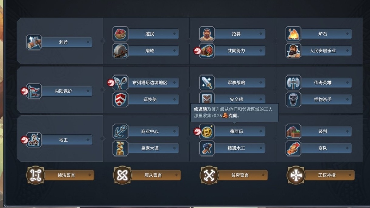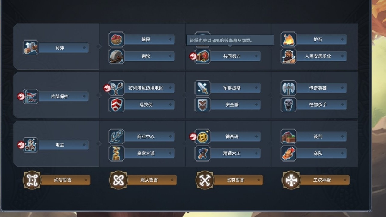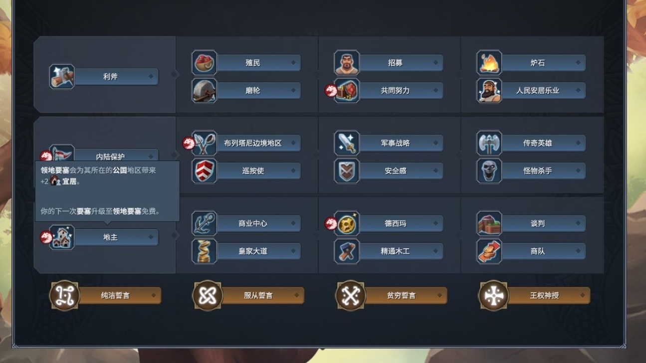 3.貿易/知識路線:地主—商業中心—德西瑪—利斧—磨輪—皇家大道—後續隨意(推薦招募或精通木工)此路線裏商業中心和皇家大道要看有沒有合適的地形再選擇先點哪個