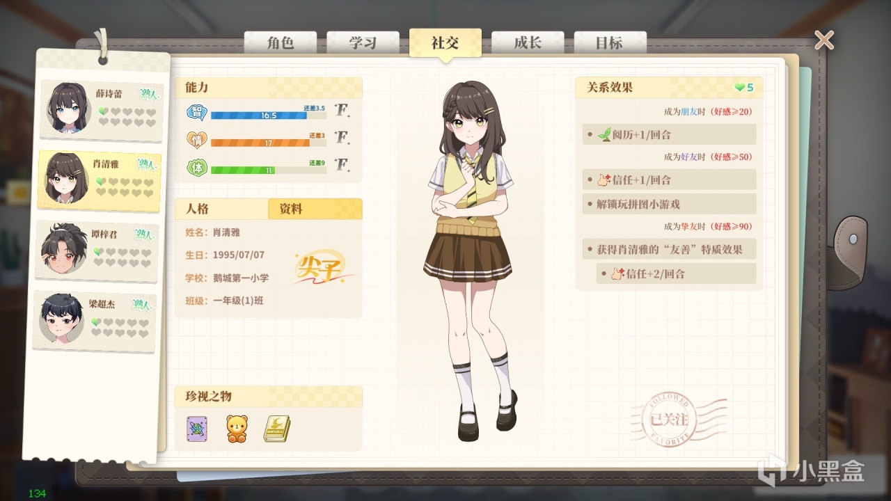 就像现实中的交友是互利、双向的一样,游戏里当双方的好感度达到一定程度后,玩家的角色会获得好友提供的不同buff,同时还能解锁其特有的行动,譬如和肖清雅拼拼图、和谭梓君弹钢琴等等,而这类行动所获得的属性提升往往是远超常规行动的。