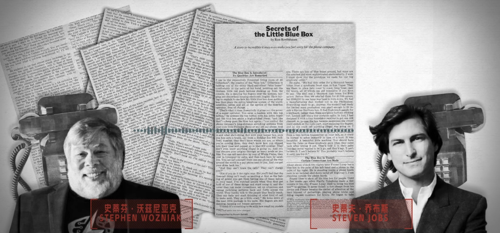 而在被捕前,Esquire 杂志写了一篇名叫 “ 小蓝盒的秘密 ”( SECRETS OF THE LITTLE BLUE BOX )的文章,介绍了 John Draper 和电话飞客的故事。这篇文章正好被一个叫史蒂芬 · 沃兹尼亚克( Stephen Wozniak )的大学生看到了,他如饥似渴地读到一半就迫不及待的给另一个志趣相投的朋友打电话,那就是刚上高四的史蒂夫 · 乔布斯( Steven Jobs )。