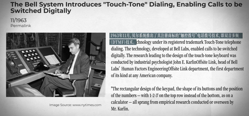 于是贝尔实验室出手了。他们研发了一种新的信号传输方式 —— 双音多频( DTMF ),这才有了后来司空见惯的电话模样。