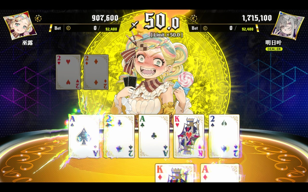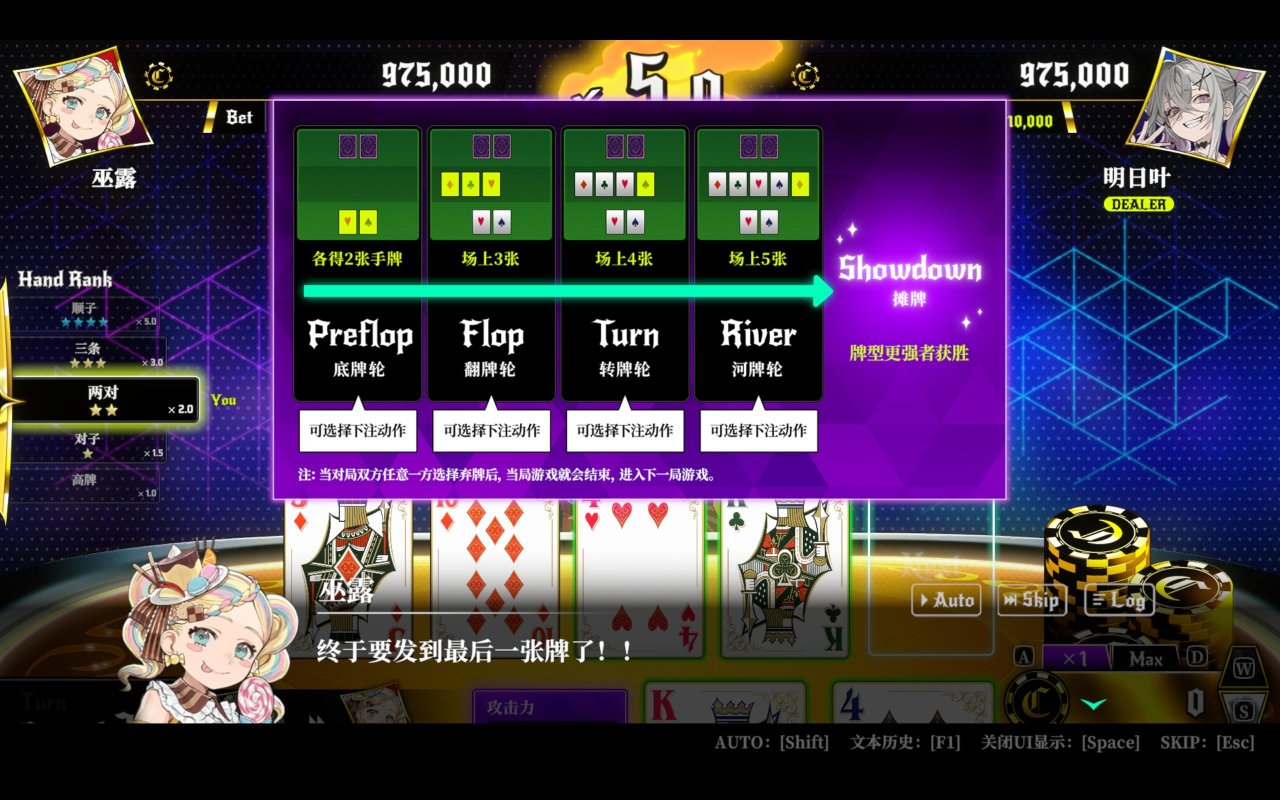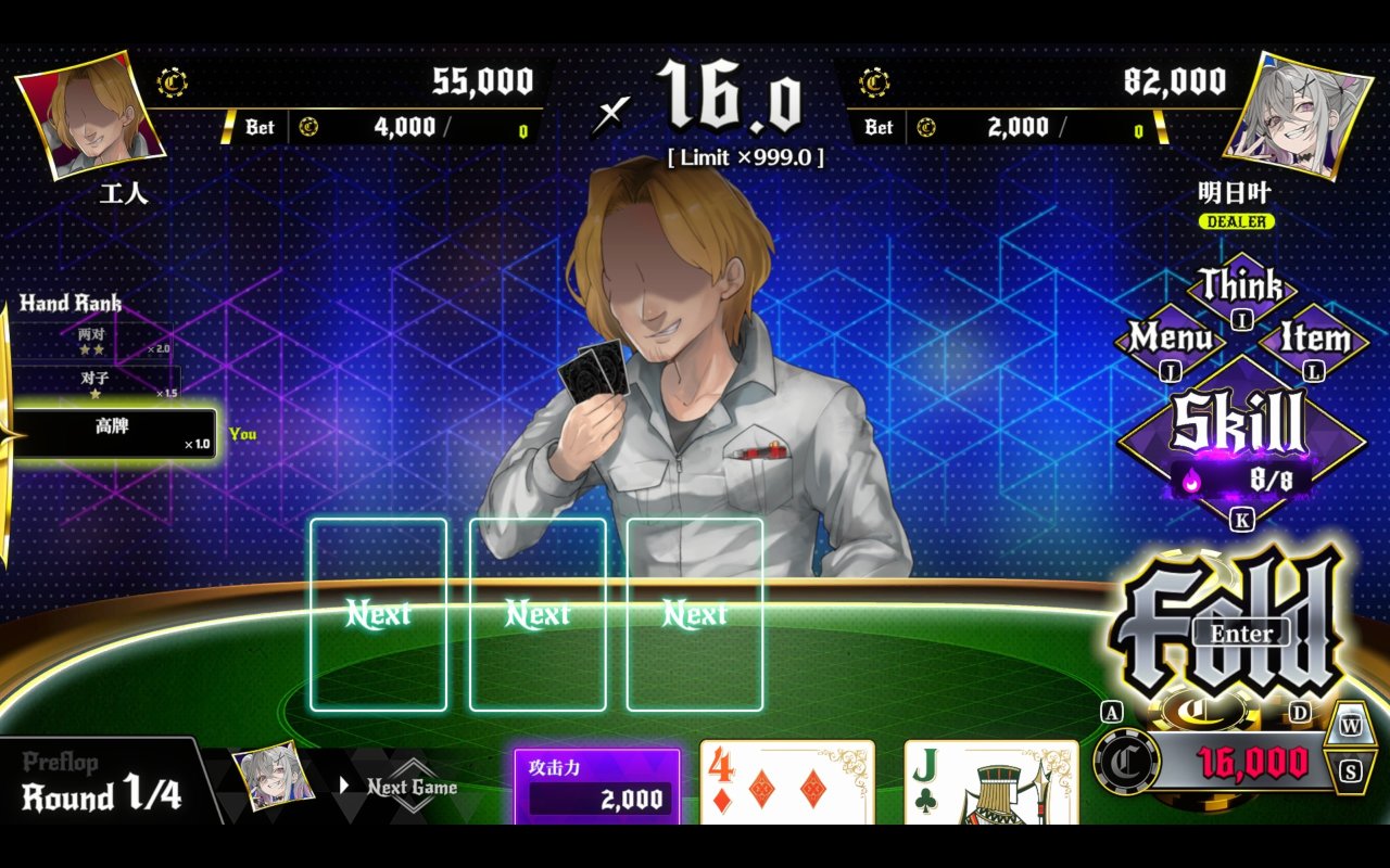 因此制作组又加入了一点小改动:弃牌惩罚。正常来讲,德扑其实是考验人的「策略执行能力」,只要你能管住手主动降低入池率、即便只打大牌收益是能稳步提升的;不过这样的扑克冗长而又无趣,所以在《深渊绝赌》中引入了「倍率」机制,每当跟注之后便会使倍率上升,只有通过开牌赢下一局以后才能让倍率复位,否则如果是通过对方弃和获胜的话倍率并不会下降,这就可能出现下面一种情况: