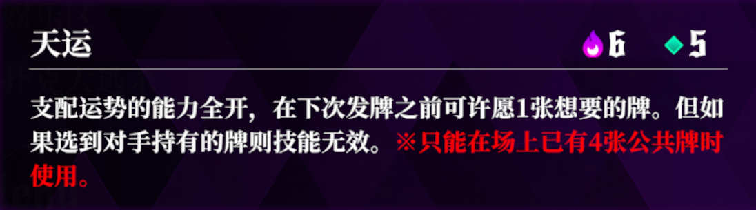 只不过咱们用的是官方许可的「技能」。而这些技能虽然有着不俗的效果,但使用条件也比较苛刻,一整局游戏其实只能用个一两次,跟德扑漫长的回合数和博弈周期比起来不值一提。