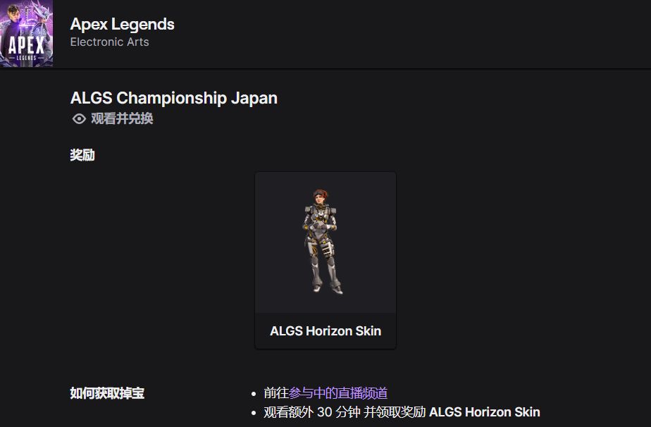 《Apex 英雄》ALGS 冠軍賽正在進行中,Twitch 平臺的掉寶也已經開啓!截止日期爲 1 月 31 日週五 GMT+8 19:59,活動獎勵爲地平線皮膚: