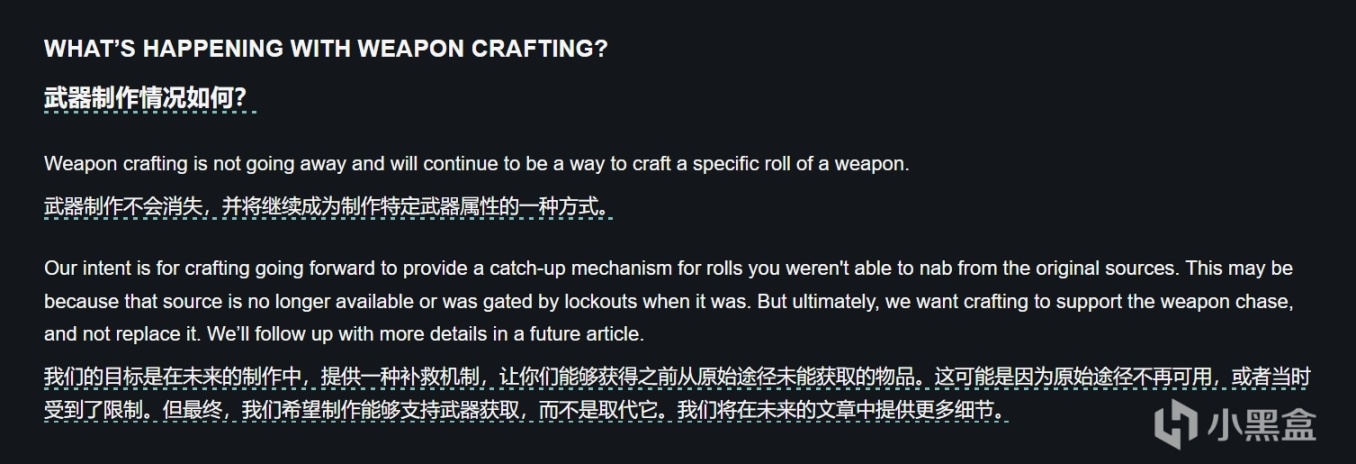 以后还有新锻造武器吗:锻造武器不会停止更新,会作为特殊武器的来源,比如新的玻璃拱顶武器锻造。同时,在未来,希望锻造系统也成为一种补救措施,让玩家能制作一些已经没有获取来源的武器作为追赶机制(无限遐想)。最终希望锻造系统能与刷武器兼容而不是完全取代。