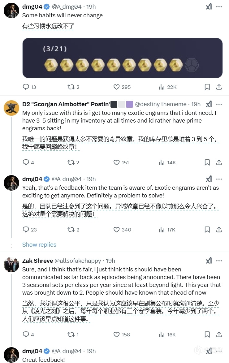 随后 Dmg04也在其推文中确认了此点,并提到目前异域水晶的系统不够吸引人,有点烂大街了,开发团队已经注意到了此点