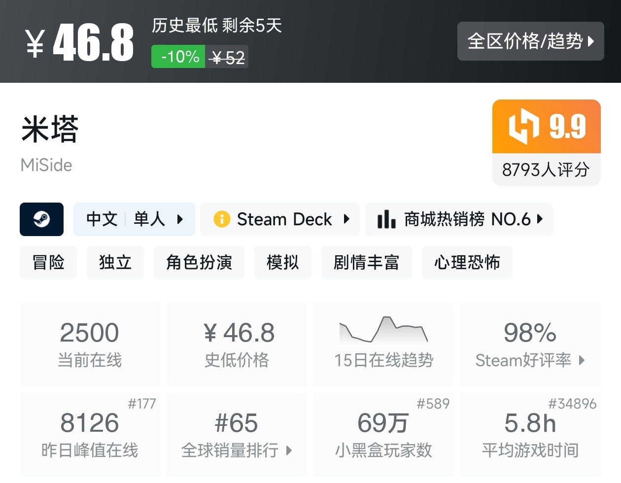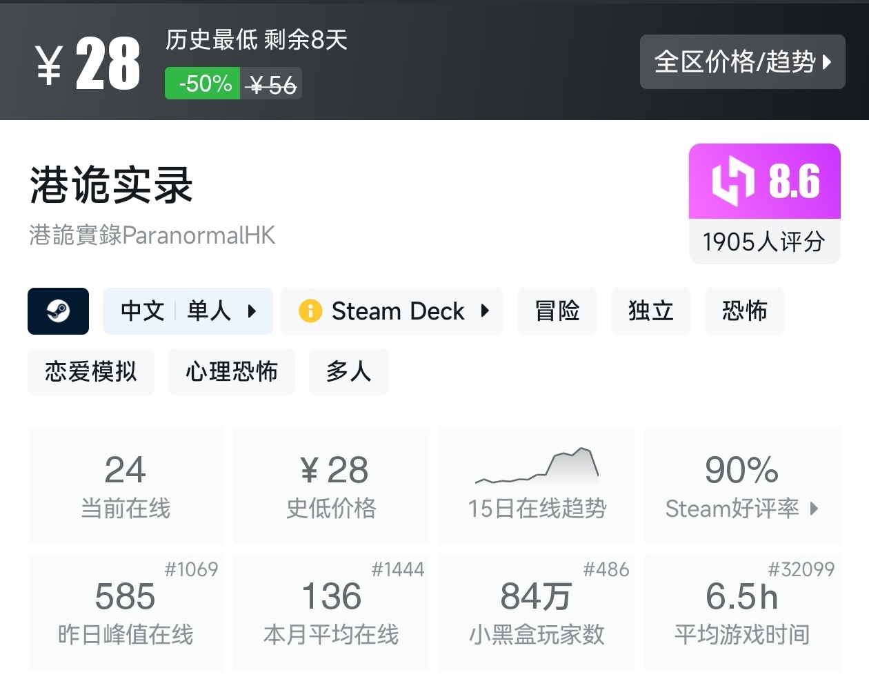 大家好,不知不觉我们Steam新春大促不同类型的的折扣游戏汇总就来到了恐怖游戏了,而恐怖游戏能带给玩家最强烈的情绪,那就是恐惧,而且很多人都挺着迷这一类型的游戏,堪称又怕又爱玩,我一样很爱玩,克服恐惧的那种感觉其实是有快感的,所以如此多的人痴迷,那么,我将为大家汇总在新春大促期间进行折扣的那些恐怖游戏,希望我的汇总,能够帮助各位盒友挑选心仪的游戏。