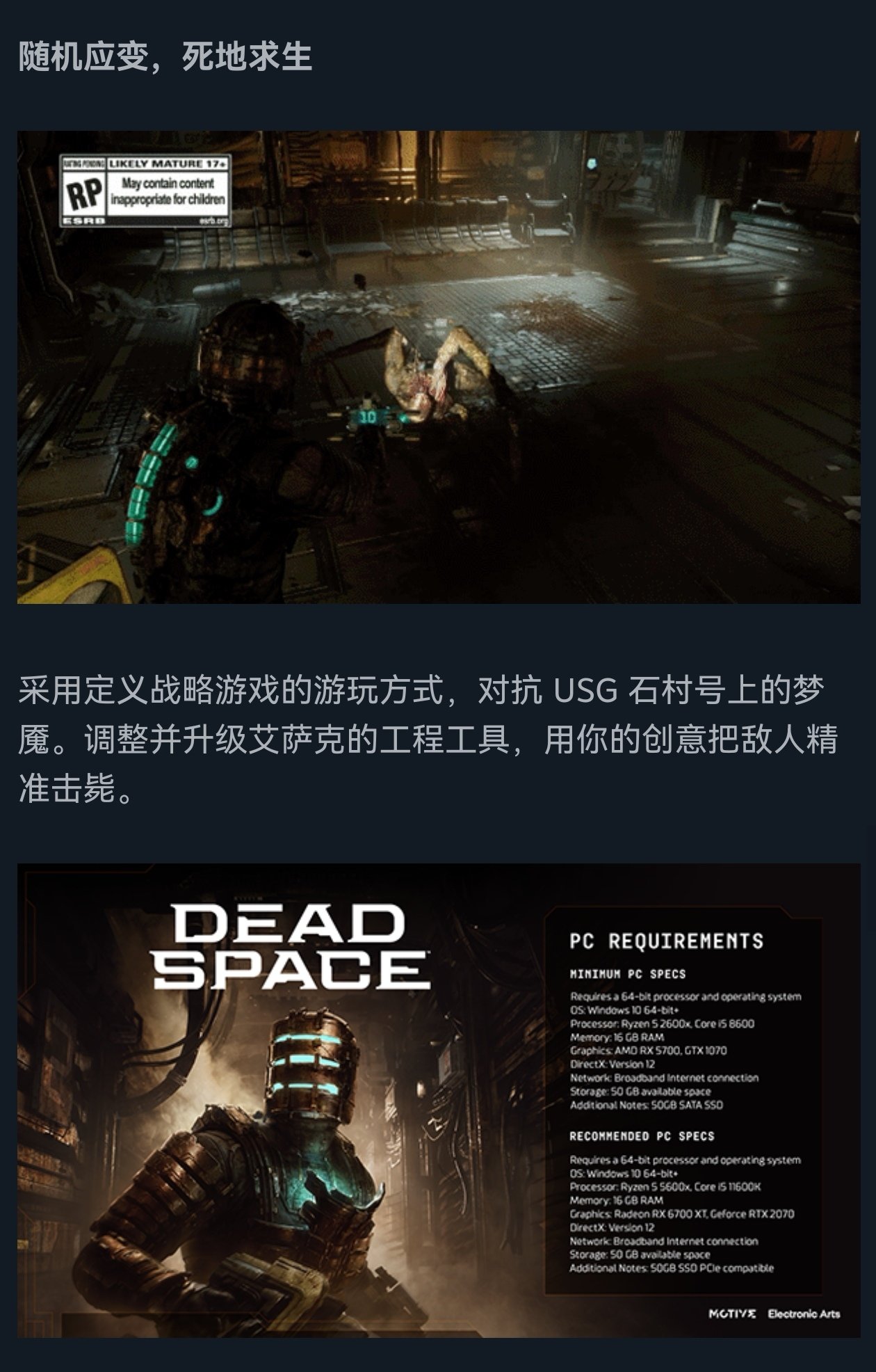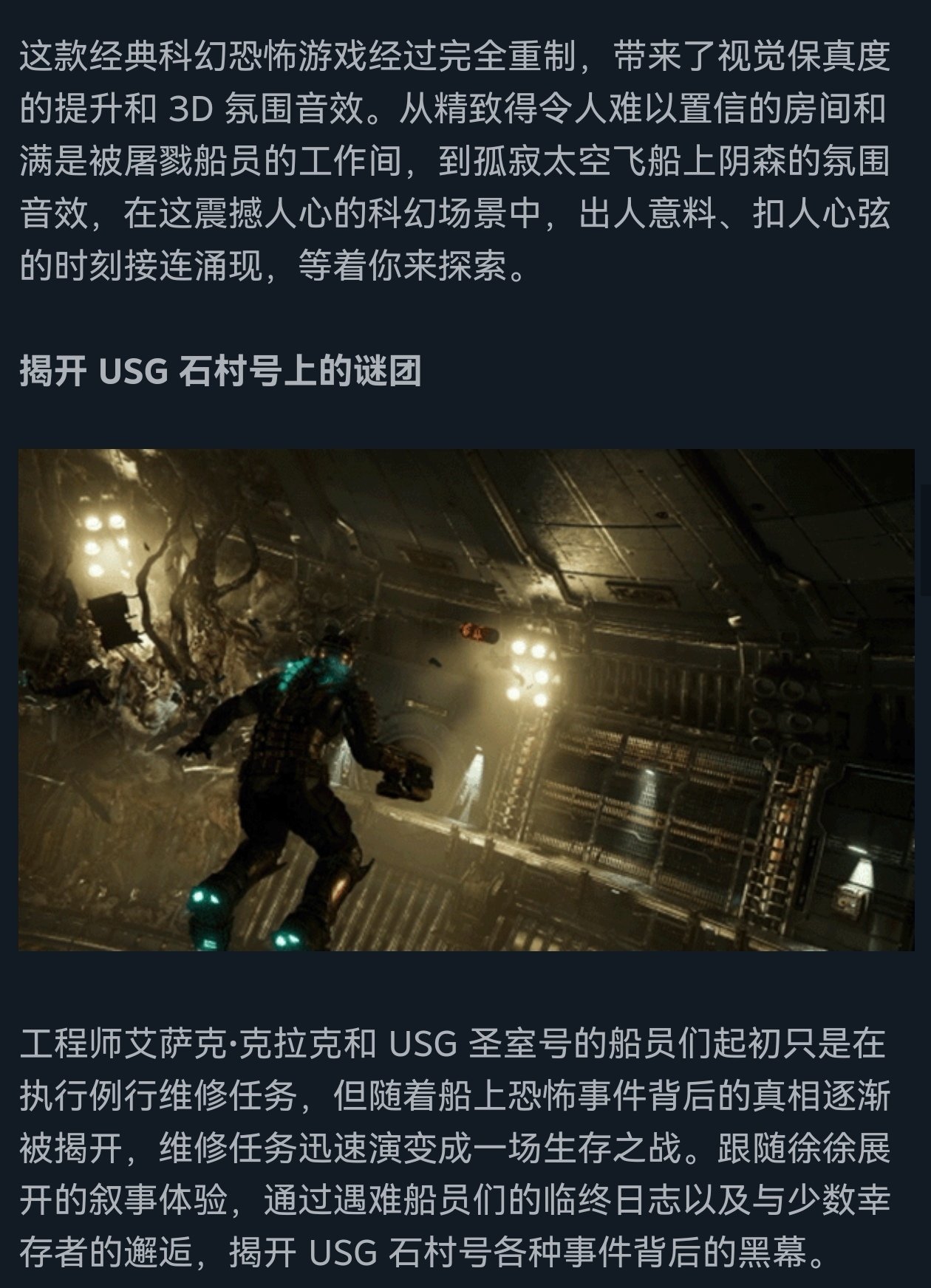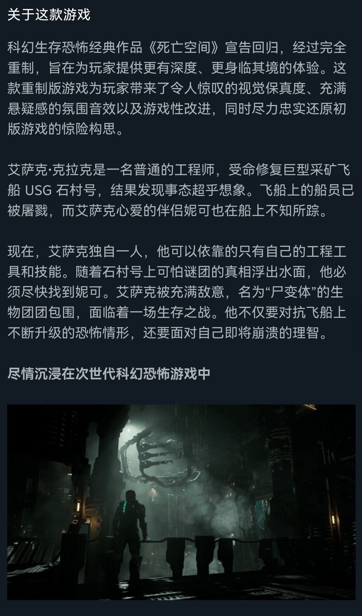 大家好,最近这不是新春大促了,虽然Steam官方V社已经取消了春节大促了,但是仍然有不少的游戏厂商自发举行了新春大促,毕竟谁会不喜欢各位玩家手中的压岁钱或者是年终奖呢,而EA旗下著名游戏《死亡空间重制版》一样打折了,该游戏为原版的重制版,只能说重制的相当成功了。
