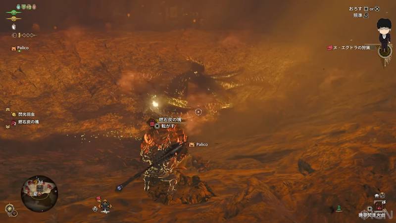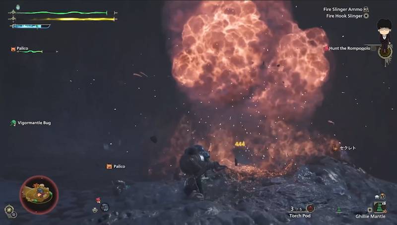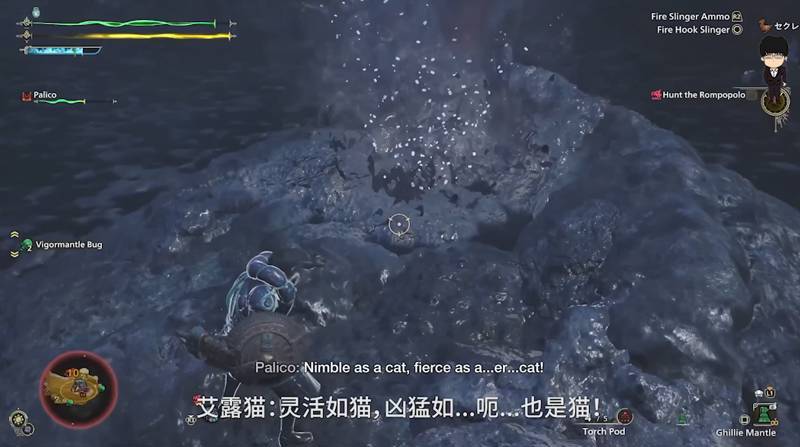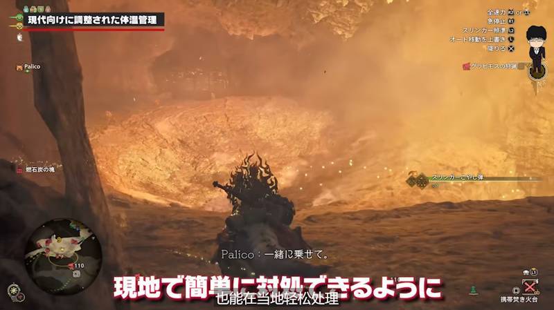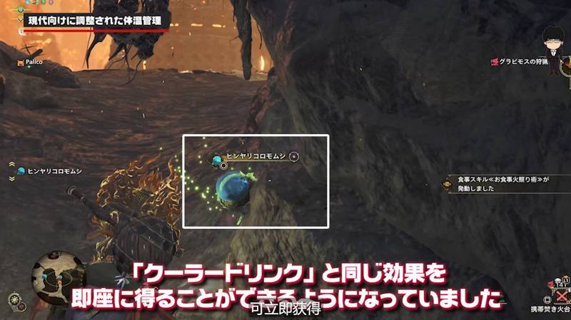 主打熱元素的“湧油谷”在體溫系統方面做了很多簡化處理。不像《世界》和《崛起》,除了常規喝冷飲來保持體溫外,區域內很多地方都有可以降溫的昆蟲棲息。使用後和喝冷飲一樣。與過往沒了冷飲要找尋對應草藥、蘑菇等道具轉換不同的是,這次獵人們可以直接獲取了。這個設定也比較符合開放世界的玩法規則。同樣這類設定在《荒野》裏的其他地圖上也有同類表現效果