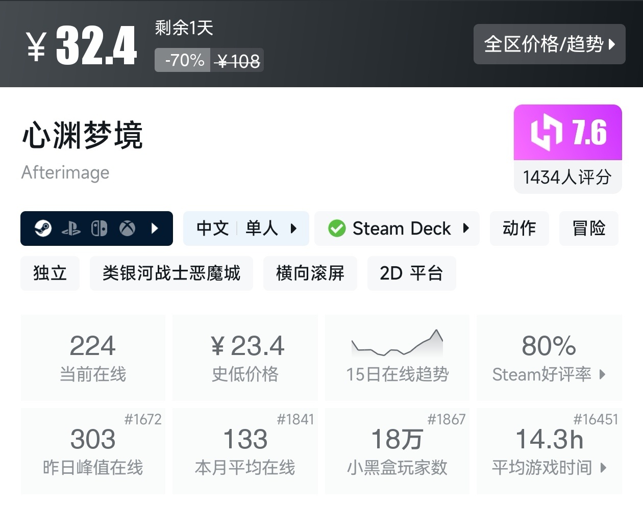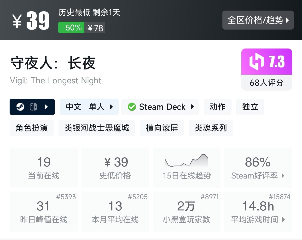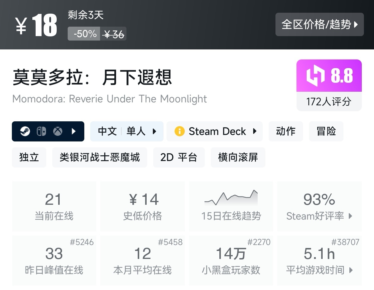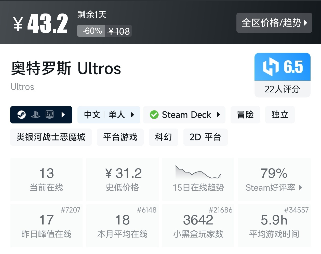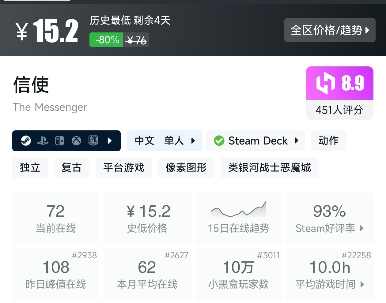 大家好,转眼我们的新春大促不同类型游戏的折扣汇总,就来到了很多独立游戏爱好者喜欢的类银河战士恶魔城游戏类型了,这个类型的游戏,视角虽然是2D的,却能创造出不亚于3A的感动,最大特点就是地图是连通的,我想给大家带来一个汇总,希望我的汇总,能够帮助各位盒友挑选心仪的游戏。