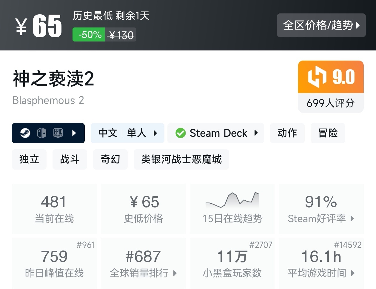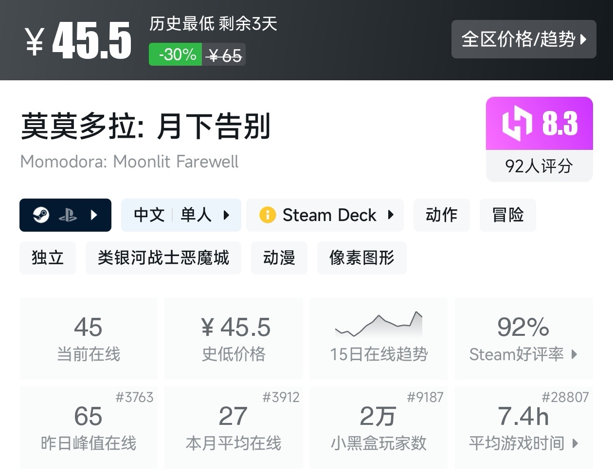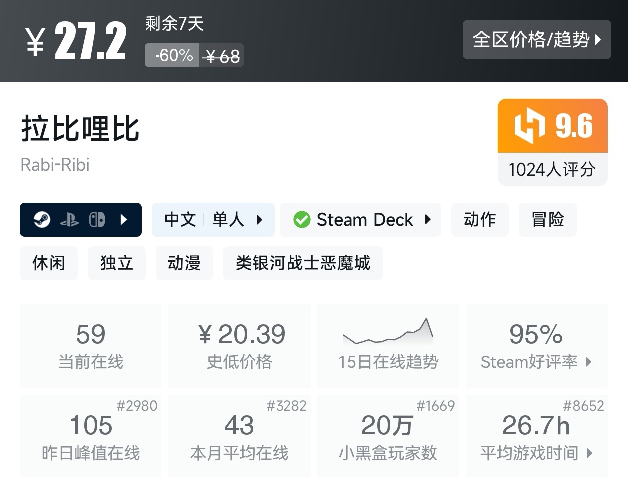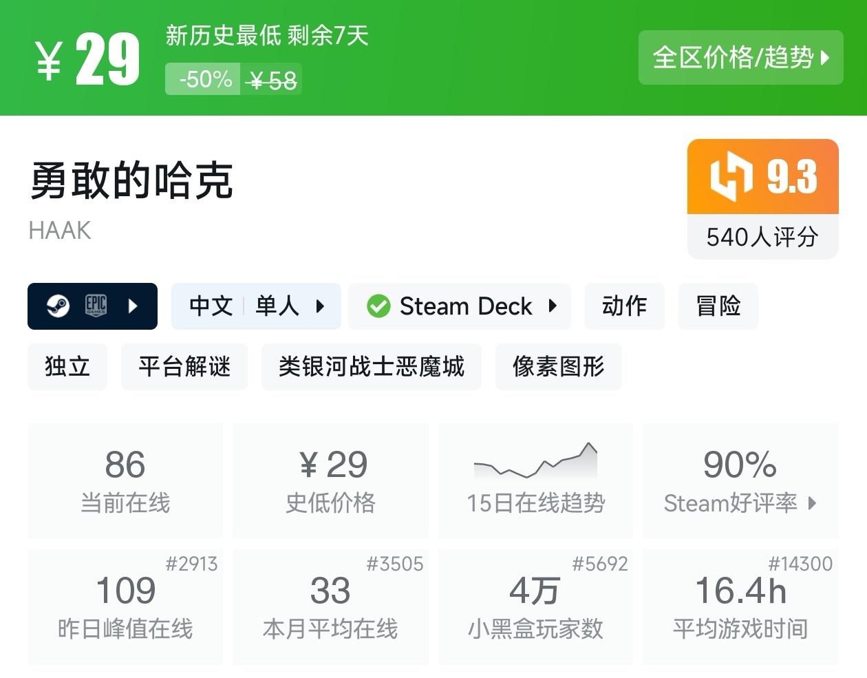 大家好,转眼我们的新春大促不同类型游戏的折扣汇总,就来到了很多独立游戏爱好者喜欢的类银河战士恶魔城游戏类型了,这个类型的游戏,视角虽然是2D的,却能创造出不亚于3A的感动,最大特点就是地图是连通的,我想给大家带来一个汇总,希望我的汇总,能够帮助各位盒友挑选心仪的游戏。