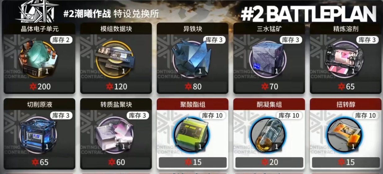 商店分为常驻奖励(常设兑换所)和限时奖励(特设兑换所)常驻奖励有皮肤、家具、五星六星干员信物、各种无限兑换的材料。限时奖励有限量的高级材料、升级模组用的材料、芯片、龙门币、作战记录和家具零件。 任务全部完成,可获得3600合约赏金,与其他模式(生息盐酸)不同的是合约赏金不能无限刷,各位新人博士需要合理分配兑换,个人推荐优先兑换限时商店部分高级材料和信物。