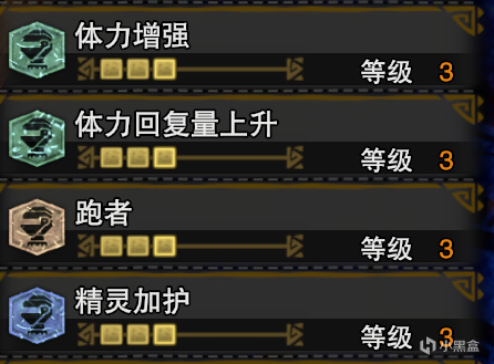 體力恢復量上升3、跑者3、精靈加護3又 分別對應 30%喝藥回血量、跑步和逐漸消耗體力的行爲耐力消耗降低50%、有概率免疫50%的傷害。