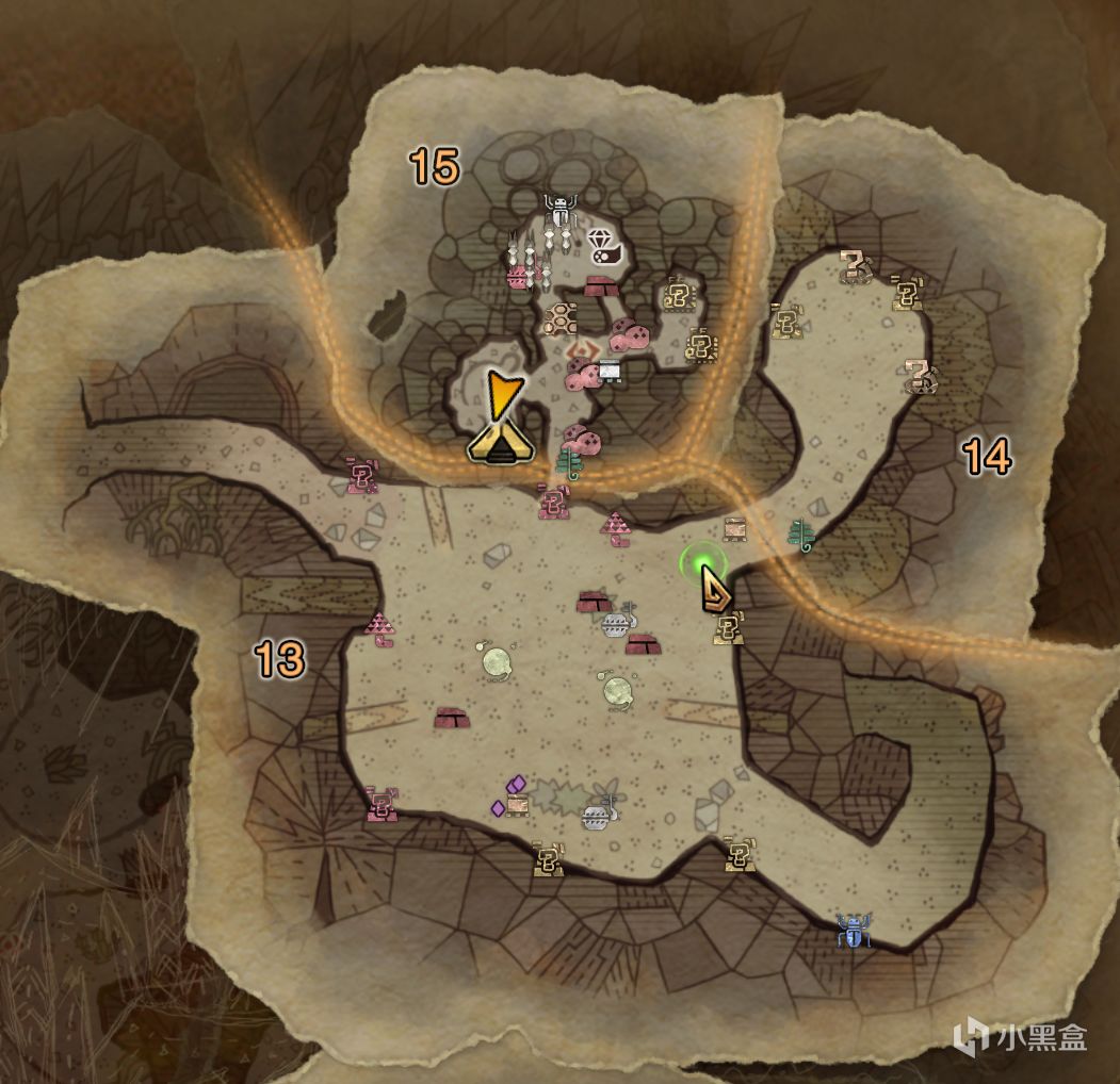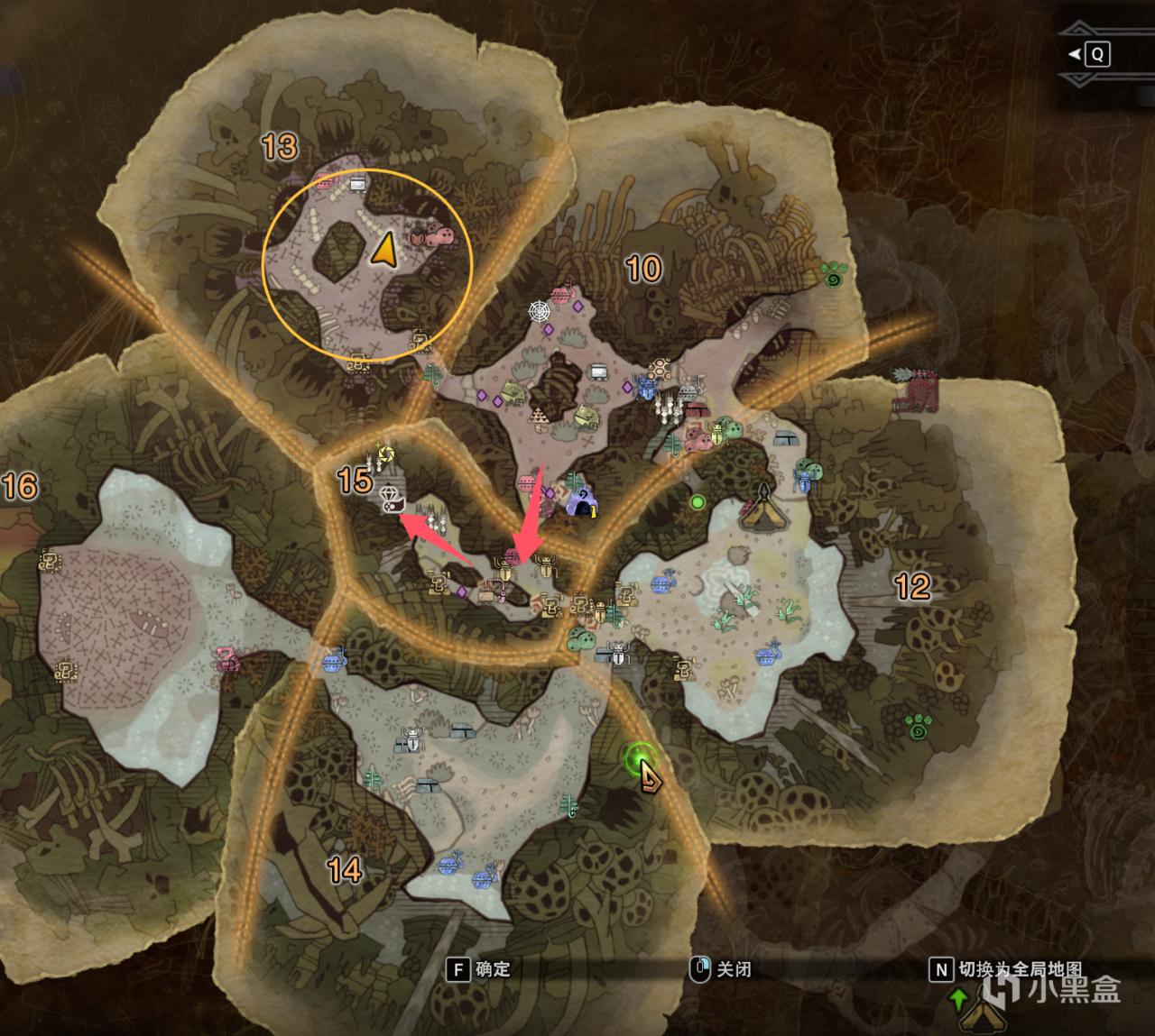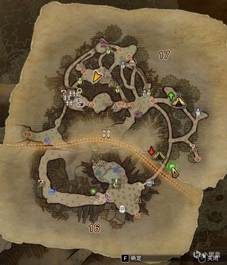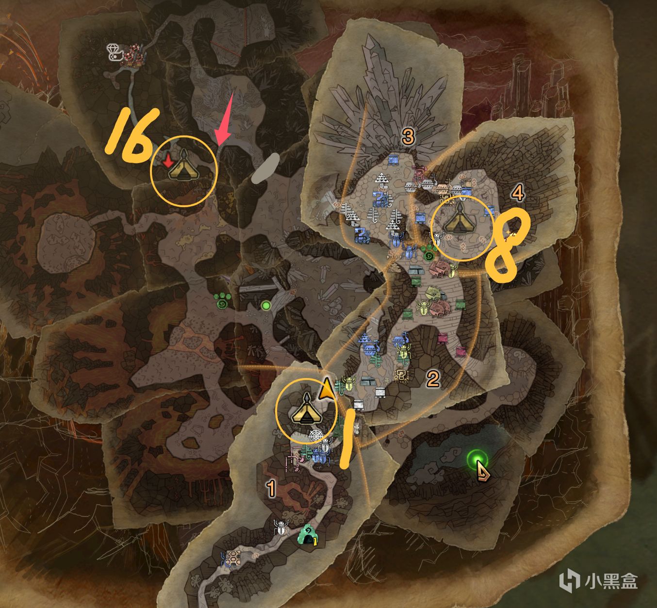 其中16號營地需要在劇情任務 渴望的黑創 的滅盡龍任務中,通過CG滅盡龍打爛圖中灰色位置的解禁後才能進去,隨後在箭頭處鑽洞解鎖。