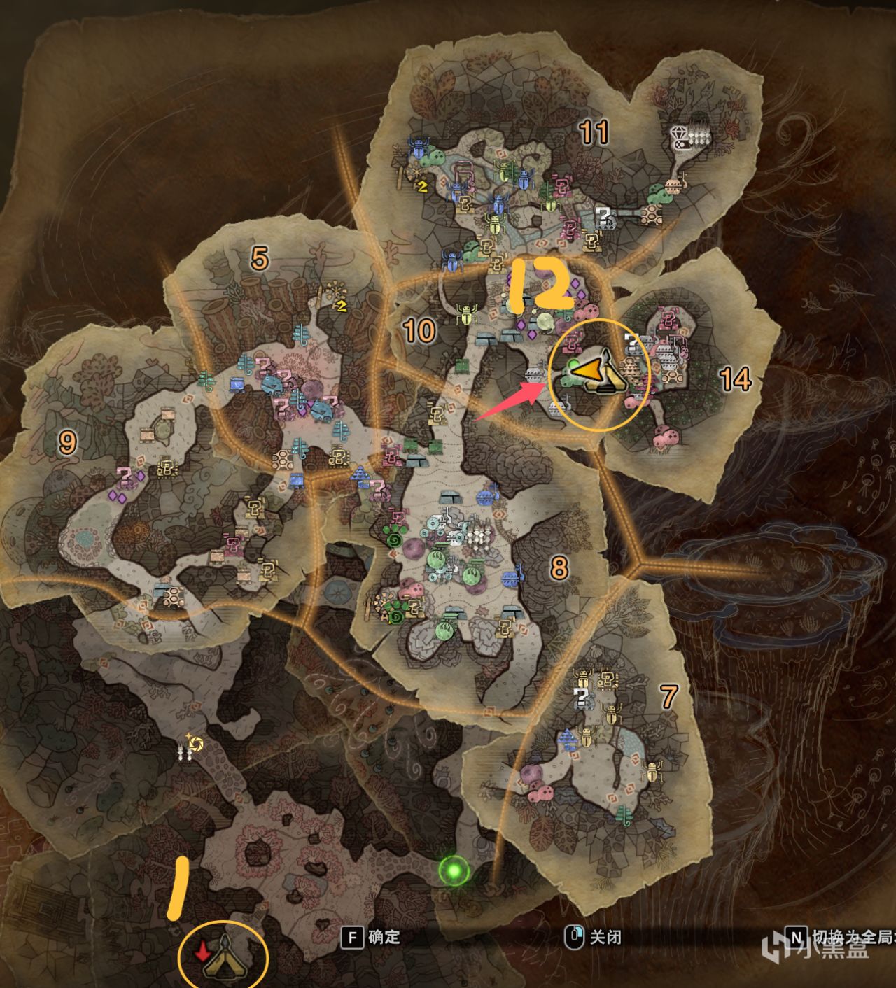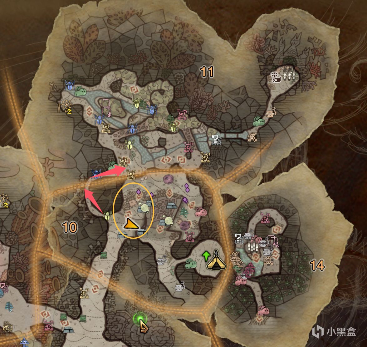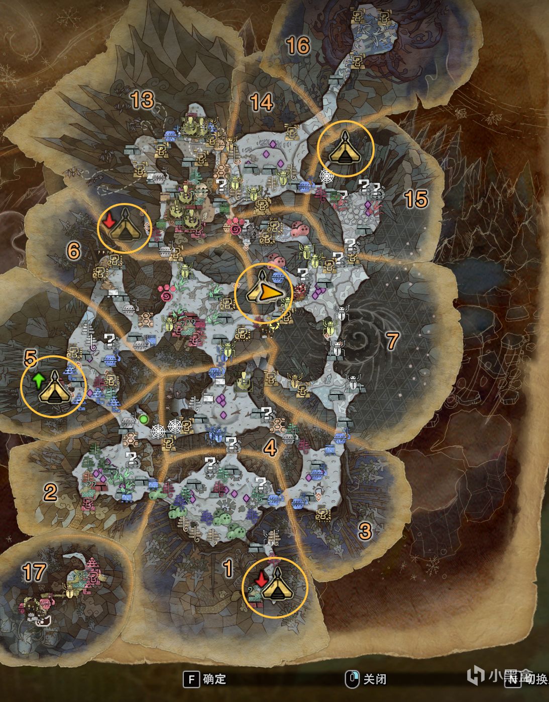 其中16號營地需要在劇情任務 渴望的黑創 的滅盡龍任務中,通過CG滅盡龍打爛圖中灰色位置的解禁後才能進去,隨後在箭頭處鑽洞解鎖。