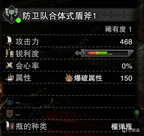 例如防衛隊盾斧的銳利度裏的顏色是什麼意思,會心(暴擊率)是什麼?除開上文提到的爆破屬性,其他的冰火水雷龍屬性又是什麼,這個武器面板上的瓶的種類又是什麼意思?