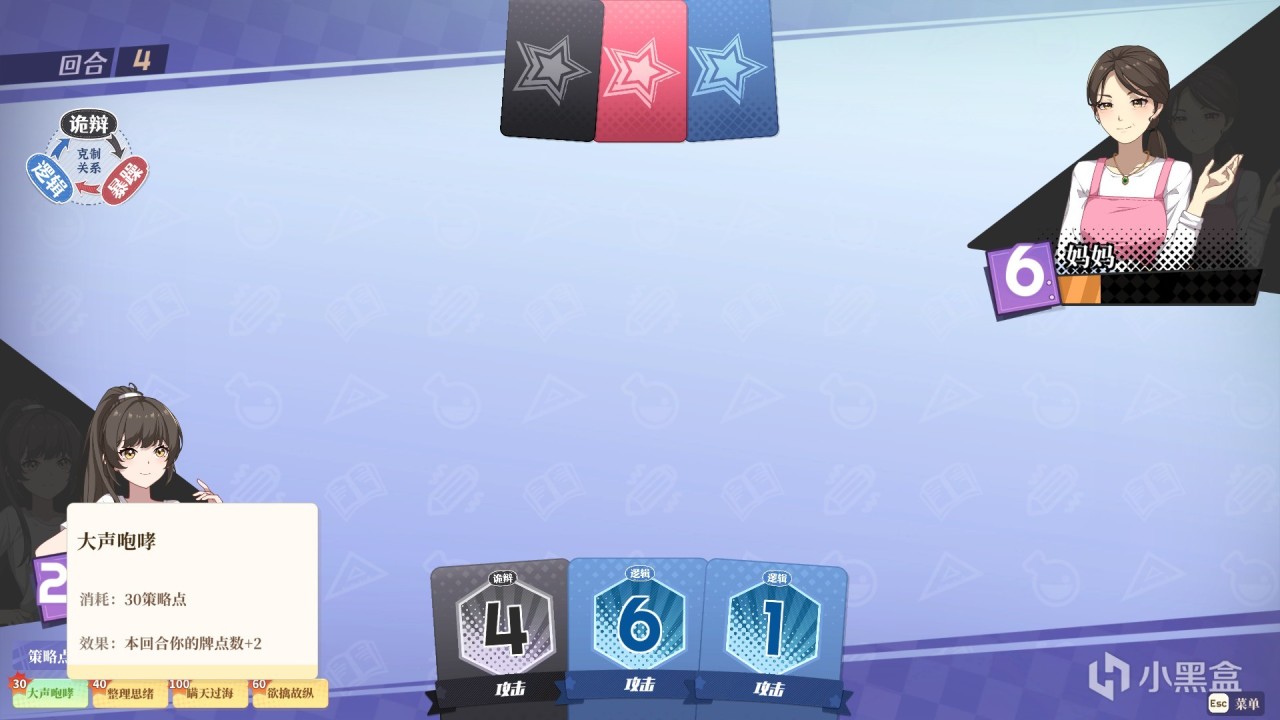 而辩论过程游戏中用有趣的卡牌点数对决小游戏来进行呈现,又加入了类似剪刀石头布的克制关系,具体表现为点数大获胜从而造成心理防线伤害,同时暴躁牌克制逻辑牌,逻辑牌克制诡辩牌,诡辩牌又克制暴躁牌,被克制的牌点数会减少一定数值然后比拼点数,其中又有独特的看破功能牌等等,十分有趣。