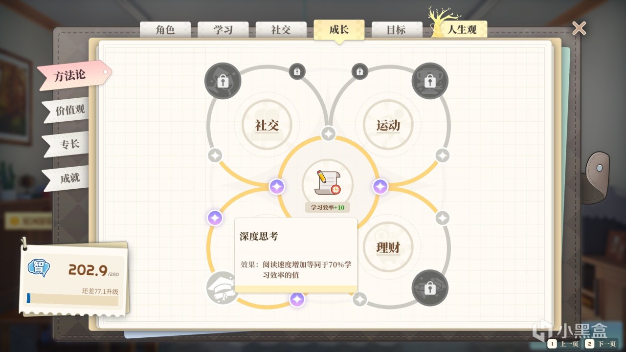 作为养成类游戏,自然和数值分不开,要注意各种数值,当然循序渐进的教程会让这些项目逐步解锁,首先是学习,这设计了学习效率来决定每次学习时推进的进度,可以通过提升角色智力来点亮方法论,从而提升学习效率,这部分就类似基建游戏中的科技树,可以通过教学楼来进行智力情商等能力的提升,从而来点击解锁方法论和选择已解锁的价值观来生效,从而增加每回合增长的能力属性。