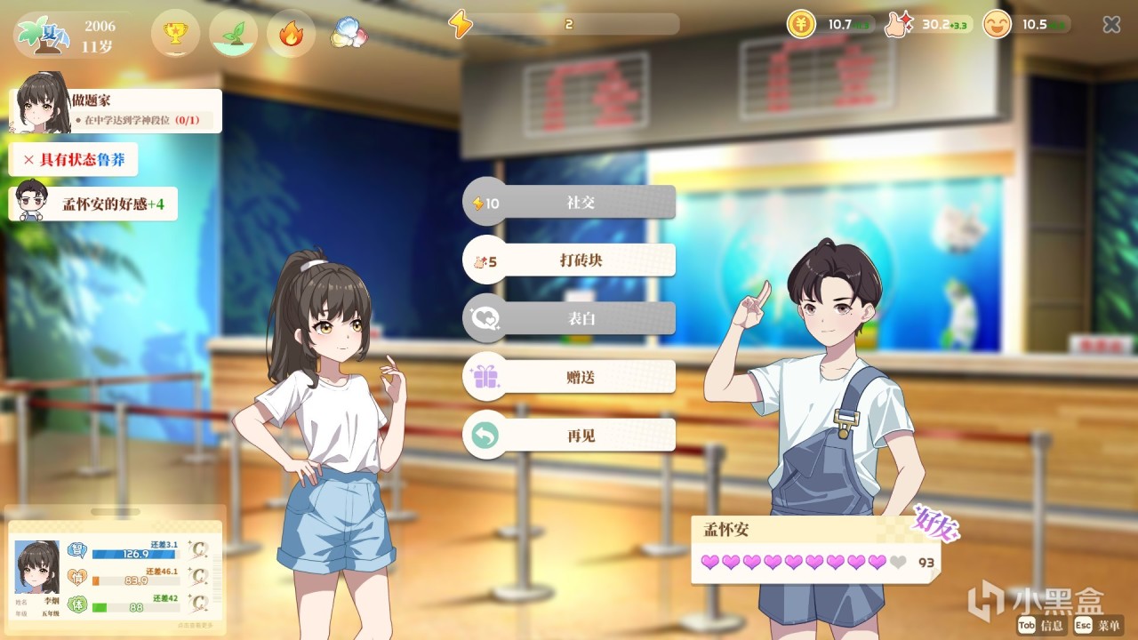 社交则从关注某个同学开始,这里首先关注的是程良,这个沉默寡言却在第一天帮主角擦凳子的小男生,当你们成为熟人就会解锁关于该同学的故事,通过外出点击同学的头像来完成社交、交谈、赠送等等选择,一步步了解该同学的同时,你的选择也会影响之后的关系发展,并且不同的关系也会获得对应效果,比如成为密友可以解锁卖货小游戏,挚友能获得节俭特质等等。