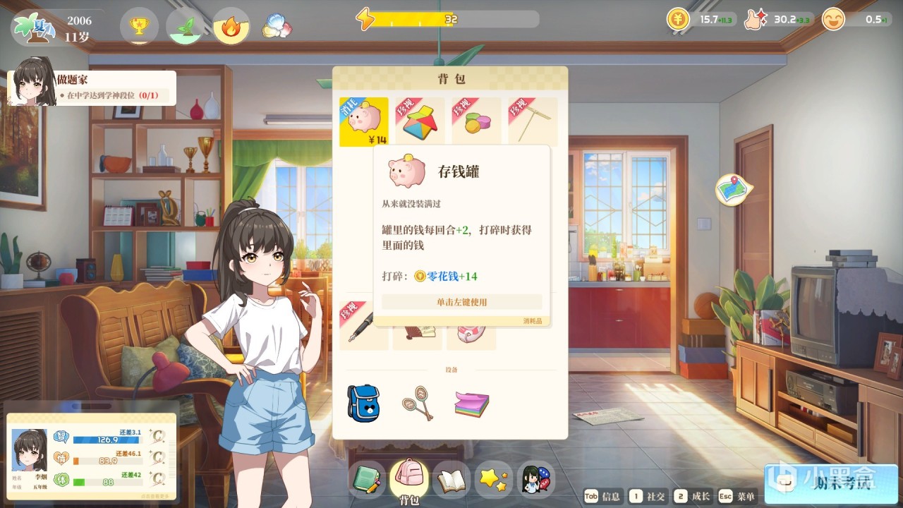 当然UI设计的十分整洁,在家中可以看到右上角则是身处的年份和主角的年龄,下方会出现主线目标,和黄叹号标识的事件提示,左下角就是角色的属性数值,点击可以进行查看,往右则能看到主人公,我的主角是梳着高马尾的小姑娘,一双会眨动的金色的瞳孔,白衬衫和蓝短裤看上去十分的可爱。