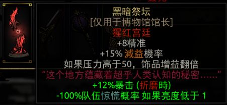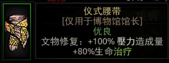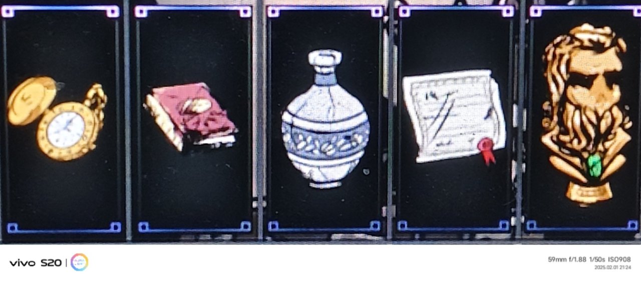 可以通過紮營或互動獲得的泛用飾品,共有五類,分別是懷錶,古典,瓷器,文獻,銅像(從左到右),售價較高,從三千到近萬都有,屬性較差,一個文物只加成一類屬性,加成也不如白飾品,五種文物加成分別爲速度,閃避,暴擊,精準,減少所受壓力傷害(從左到右)