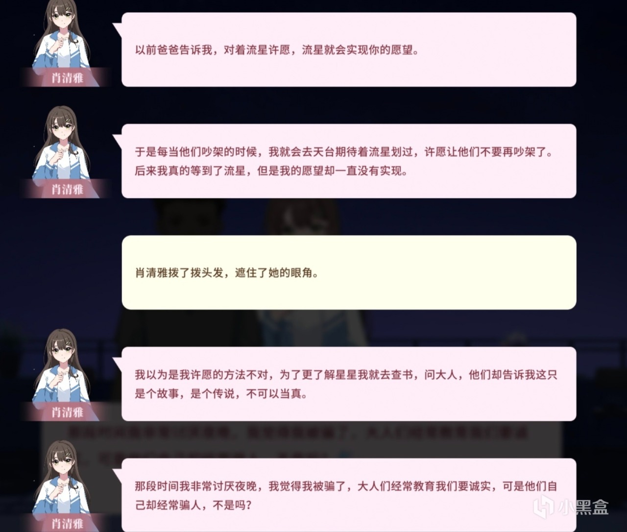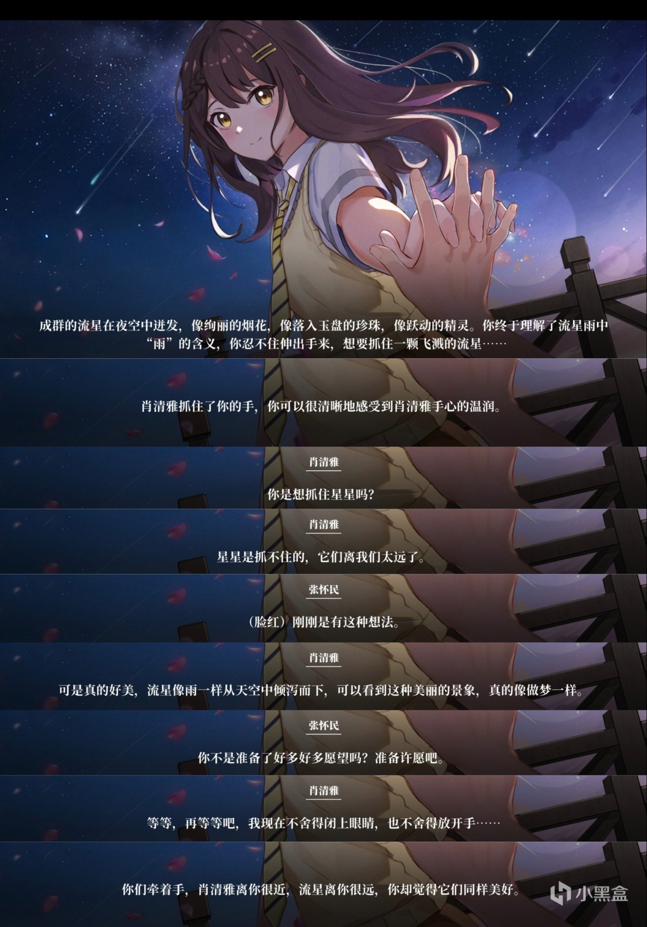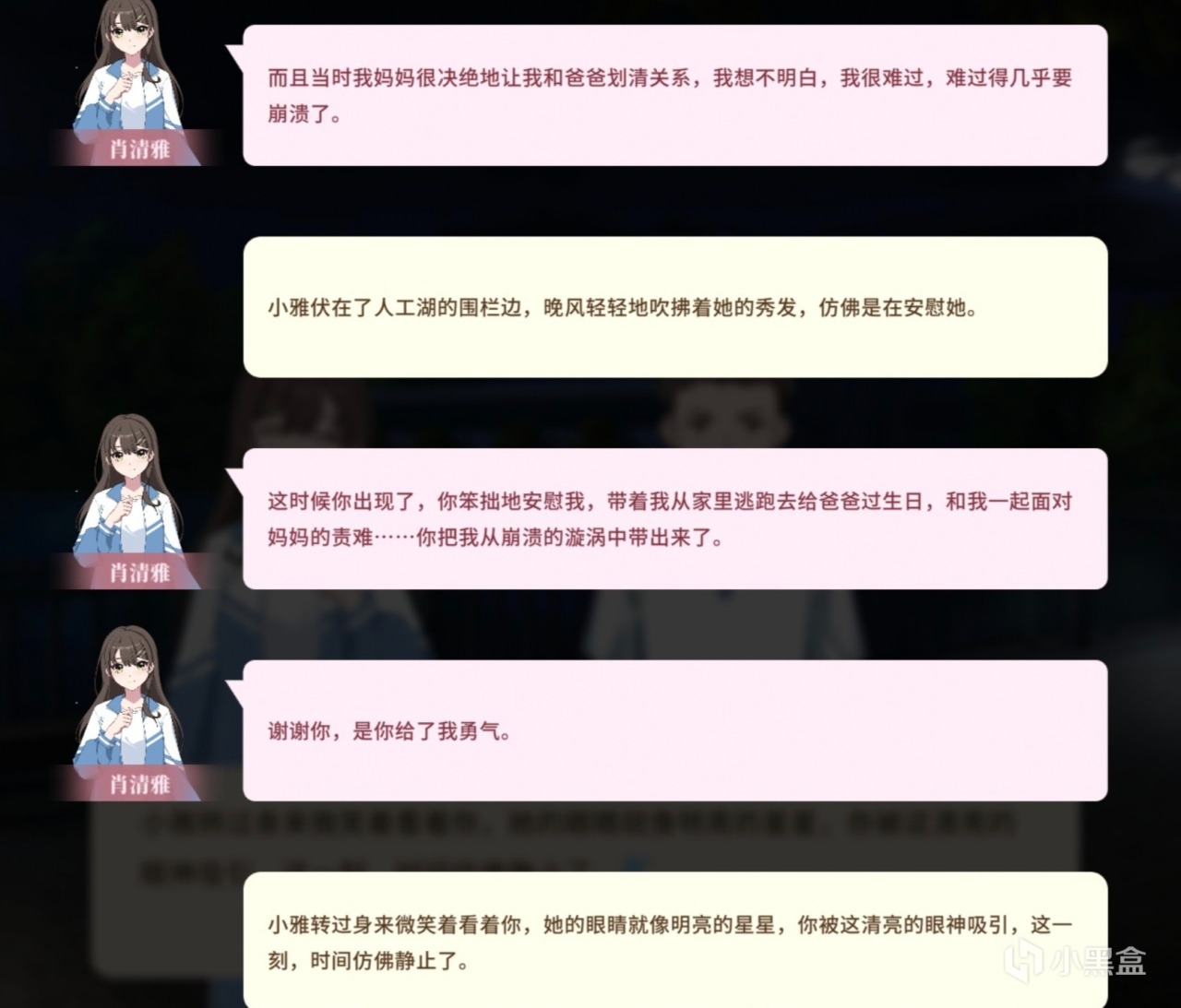 其他角色的戀愛線我還沒玩,但至少通過肖清雅的這條感情線,你能明顯感受到《學生時代》文案的功底以及對氛圍營造的細膩: