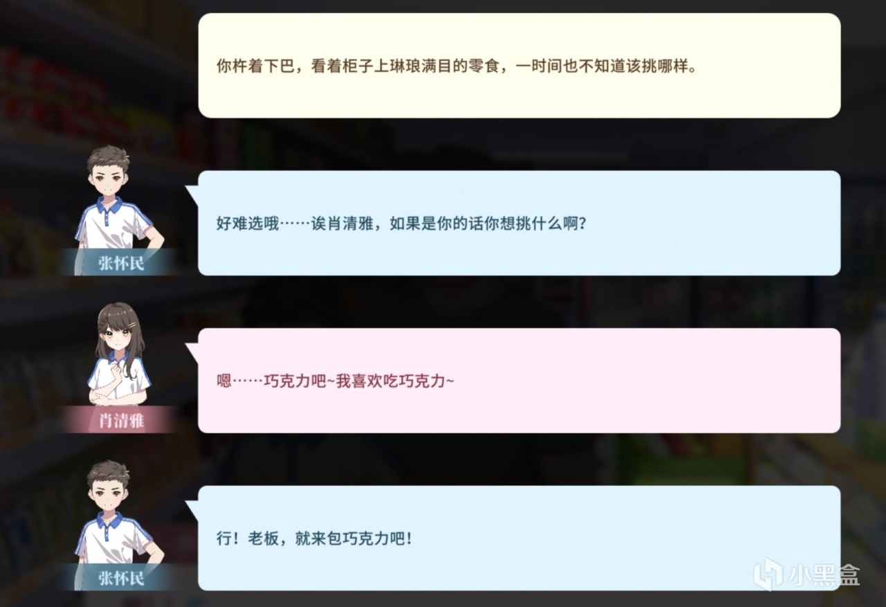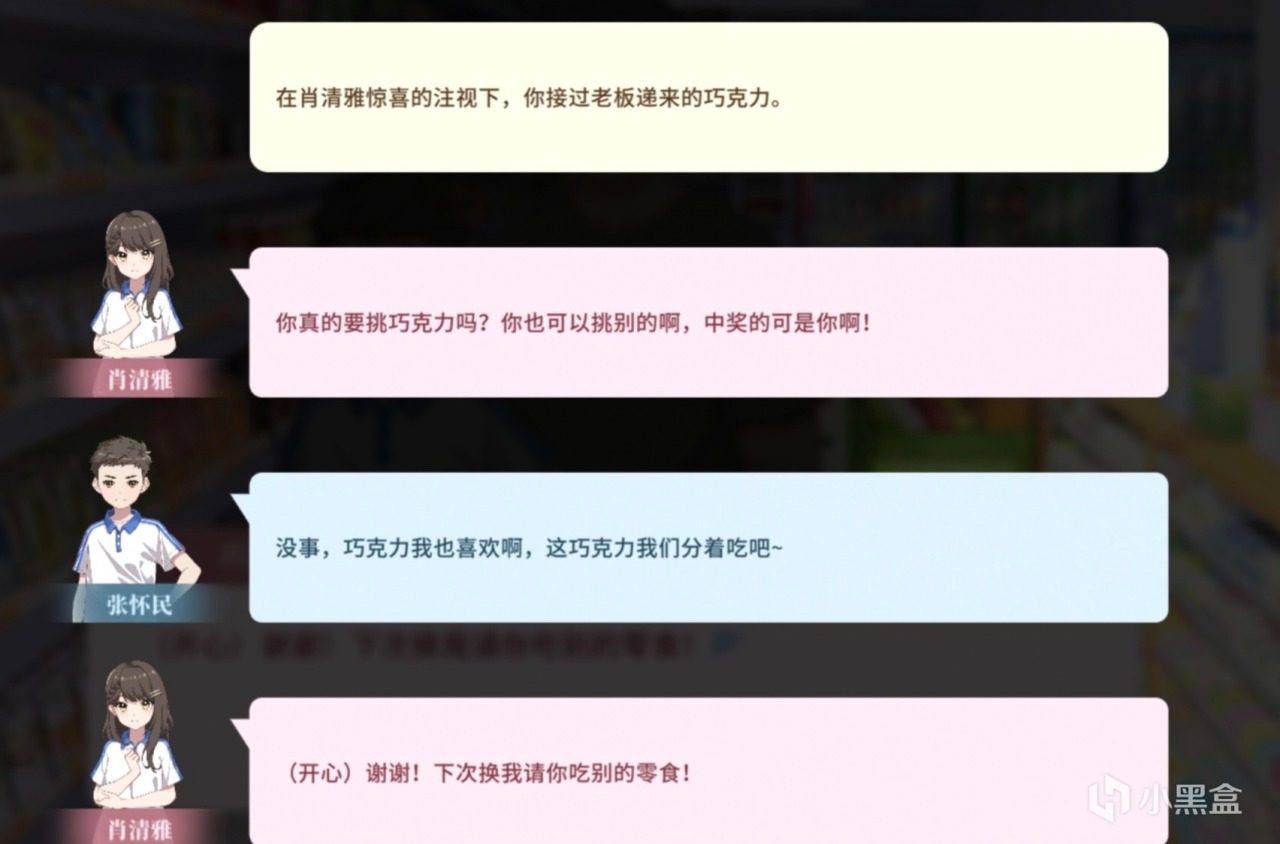 肖清雅拉着主角去小賣部抽獎,結果主角真的中了一個零食任選的獎項,主角糾結不知道該選什麼零食。然後發生瞭如下圖對話: