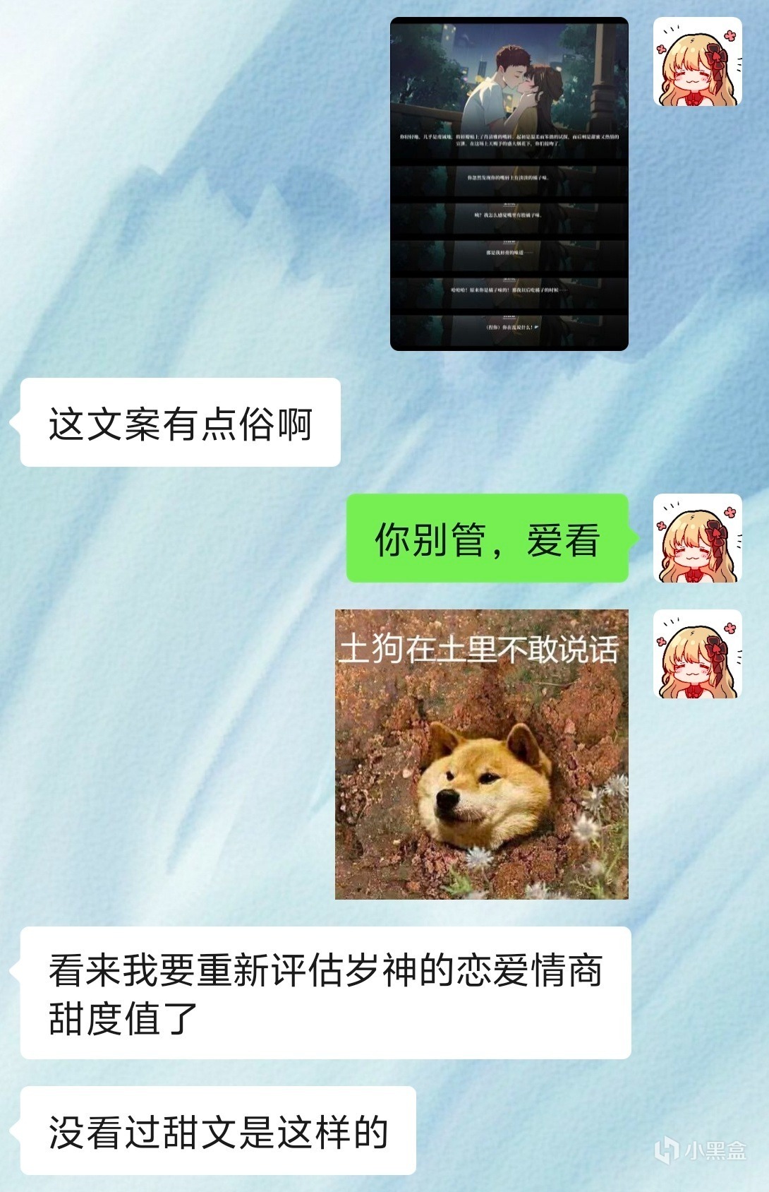 不過每個人的喜好和閾值不一樣,我把擁吻那段的完整劇情截圖發給朋友(男的)之後他卻表示——這文案有點俗啊