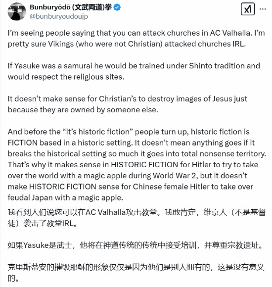 不過也有玩家進行了反駁,維京人襲擊教堂合理,但彌助作爲武士,他肯定是接受過神道教傳統的教育的,一定會尊重宗教的神社。