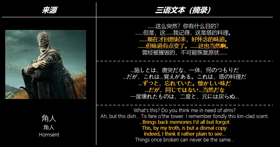 如果把角人老嫗的煮蝦湯給角人復仇者,還會觸發一段特殊的對話,從這個信息上看,復仇者似乎和老嫗也有某種親密的關係,或許就是他的嫡系長輩。