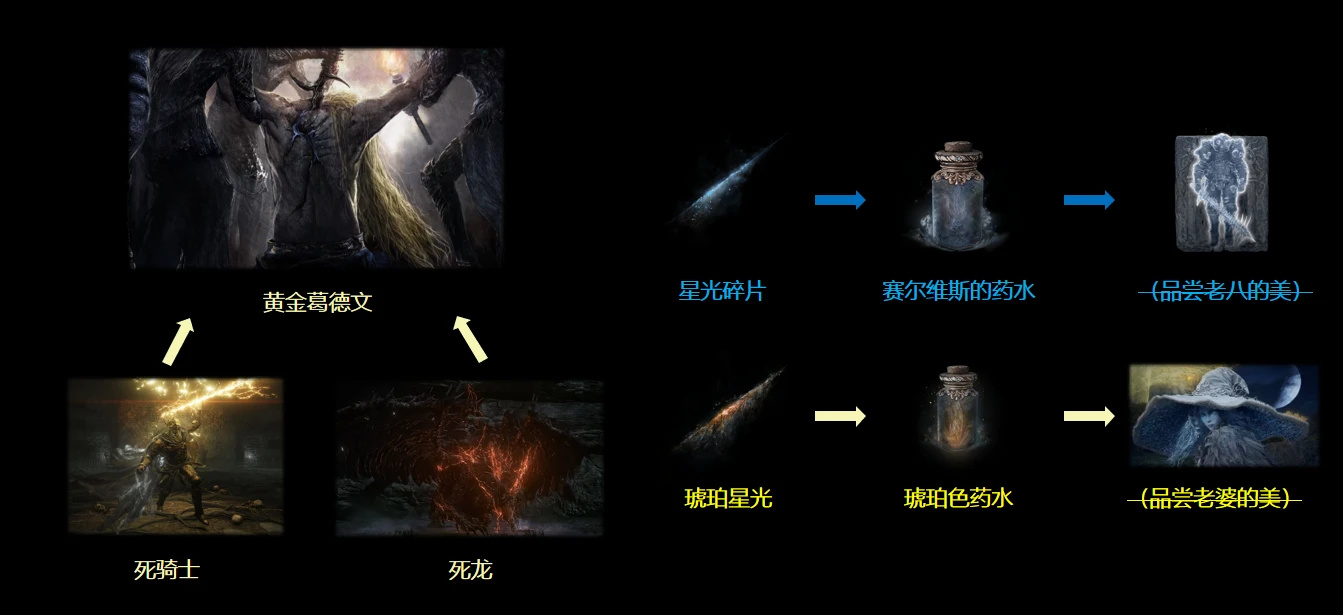 死龍與死騎士似乎對葛德文的忠誠過了頭,就算是死了也不肯放過,實在有些過於戲劇性。而在製造傀儡的過程中,賽爾維斯會使用星光碎片製成藥水來製作凡人的傀儡,而要操控菈妮這樣的半神,卻必須要使用琥珀星光製成的特殊藥水,因爲“琥珀色的星光就代表着諸神的命運“。