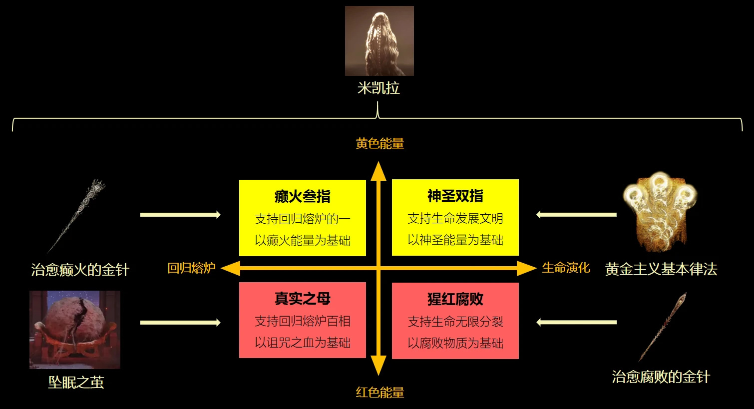 前兩代的古龍與瑪莉卡作爲容器之神,他們仍然會以無上意志爲核心。但米凱拉不同,逆向彎弧意味着他要重新創造一個以他自己爲核心的新生意志。