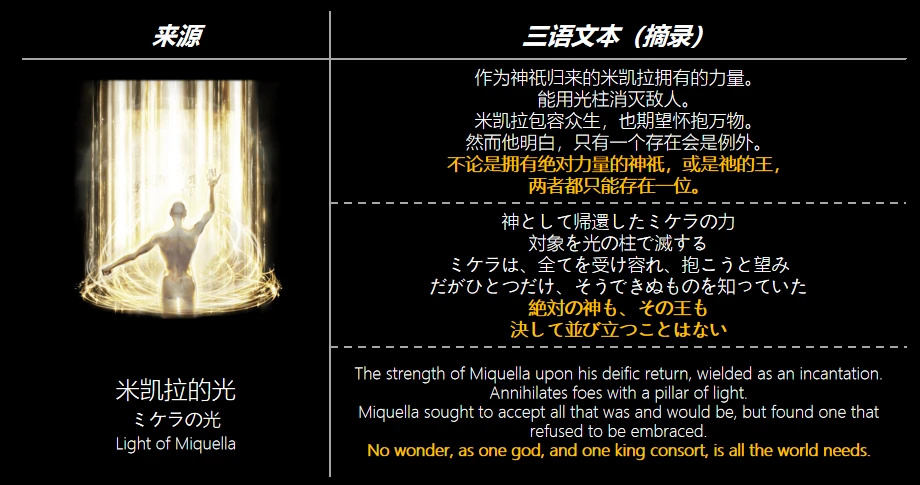 基於“弒神”的文本,很多人往往會以此爲理由,認爲腐敗女神並不是真正的神,我認爲並非如此。無論是瑪蓮妮亞,古龍王還是指頭之母,他們都可以在某種語境內被當作“神”。但關鍵的問題在於,神本身也有位階之分。米凱拉和艾爾登獸就是更高階的神——他們都是創世神無上意志的化身。而這種化身最明顯的共同特質便是具有一種黃色純粹的光柱,這也是我在整篇《法環編年史》最開頭所提到的“創世之光”。