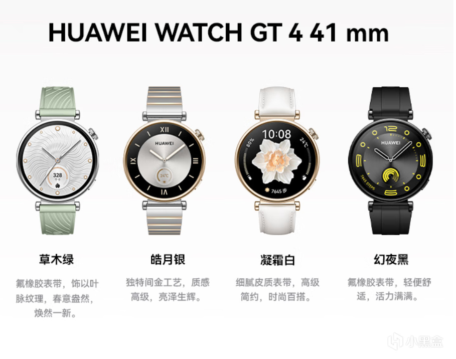 華爲 Watch GT4 有 41mm 和 46mm 兩種尺寸。41mm 適合女生,續航 7 天;46mm 續航長,能到 14 天。它用的是 HarmonyOS 4 系統,有科學減脂塑形功能,健康監測很全面,運動模式也超多。外觀設計很時尚,錶帶還能換