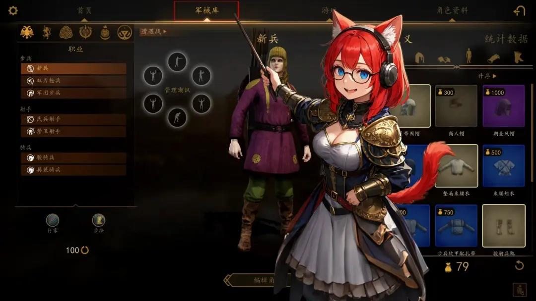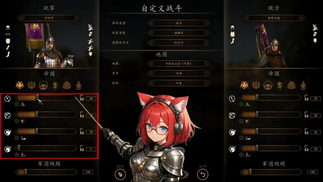 左側可以選擇玩家扮演的NPC,六個圖標分別代表6個國家可供選擇。下方可以選擇四個兵種的配置比例,點“加號”可以添選具體兵種。