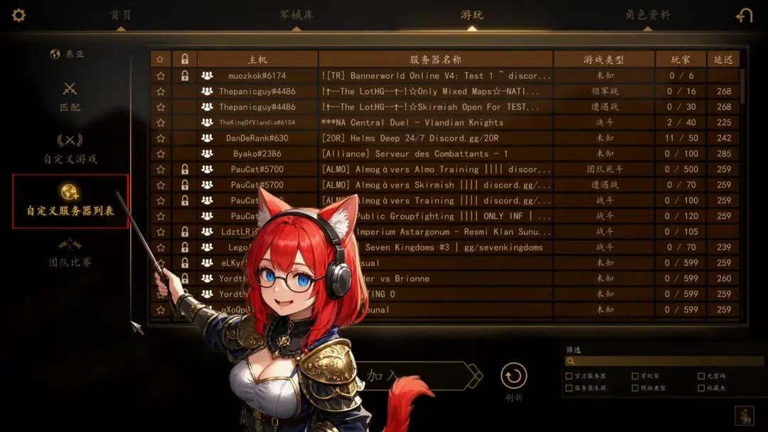 而在“遊玩”界面中可以選擇可以看到有“匹配”、“自定義遊戲”、和“自定義服務器列表”以及“團隊比賽”。新手一定要先從國服練起,點擊“自定義服務器列表”,再點擊右上角的“延遲”進行排序。