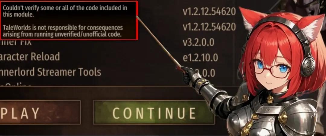 而紅色歎號則是官方的免責聲明,將上面的英文翻譯過來就是“無法驗證此模組中的部分或全部代碼,TaleWorlds不對運行未經官方驗證或非官方代碼模組所產生的後果負責”。