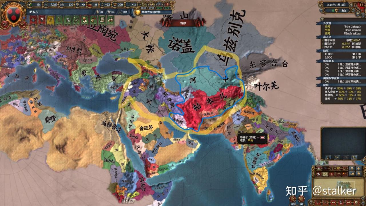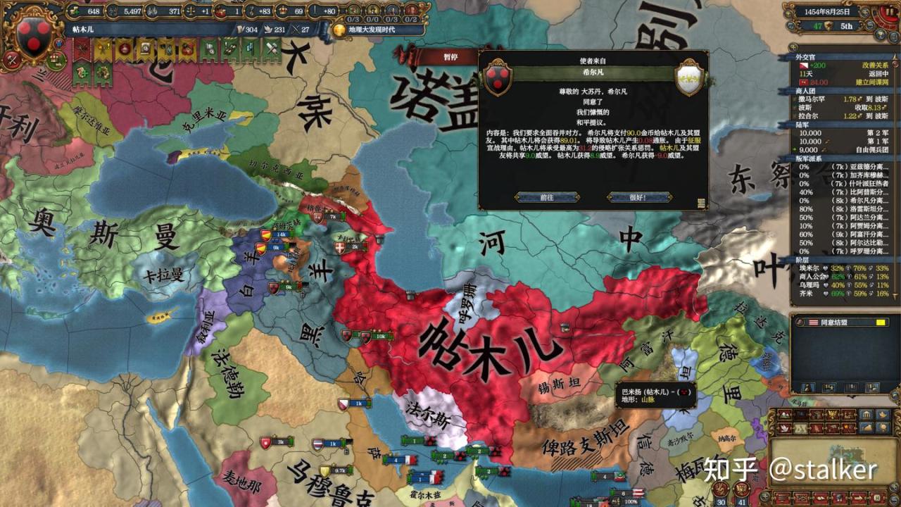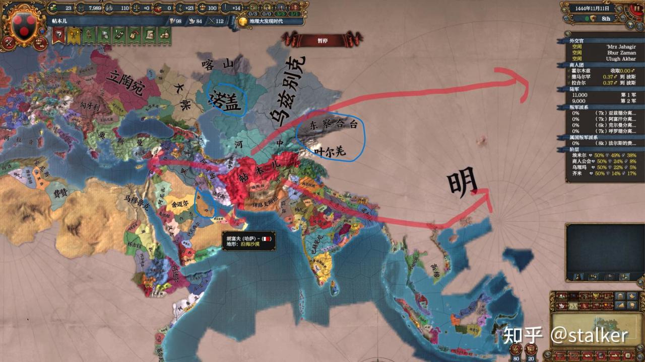 外交方面沒有近憂,帖木兒加上五位附庸的體量依舊不容小覷,新崛起的黑羊白羊阻擋着歷史宿敵奧斯曼和馬穆魯克,其他方向沒有強敵。與隔着巴士拉的哈薩結盟,未來可以附庸,並將阿拉伯半島的土地暫交其統治;與北面的諾蓋結盟,牽制大帳與烏茲別克;與老東家東察合臺拉關係結盟,目前還不是主要擴張方向,且東察合臺都是高原山地凍土,圍困艱難(所以帖木兒根本到不了大明),結盟爛地所有者,比爛地所有者結盟對手強。