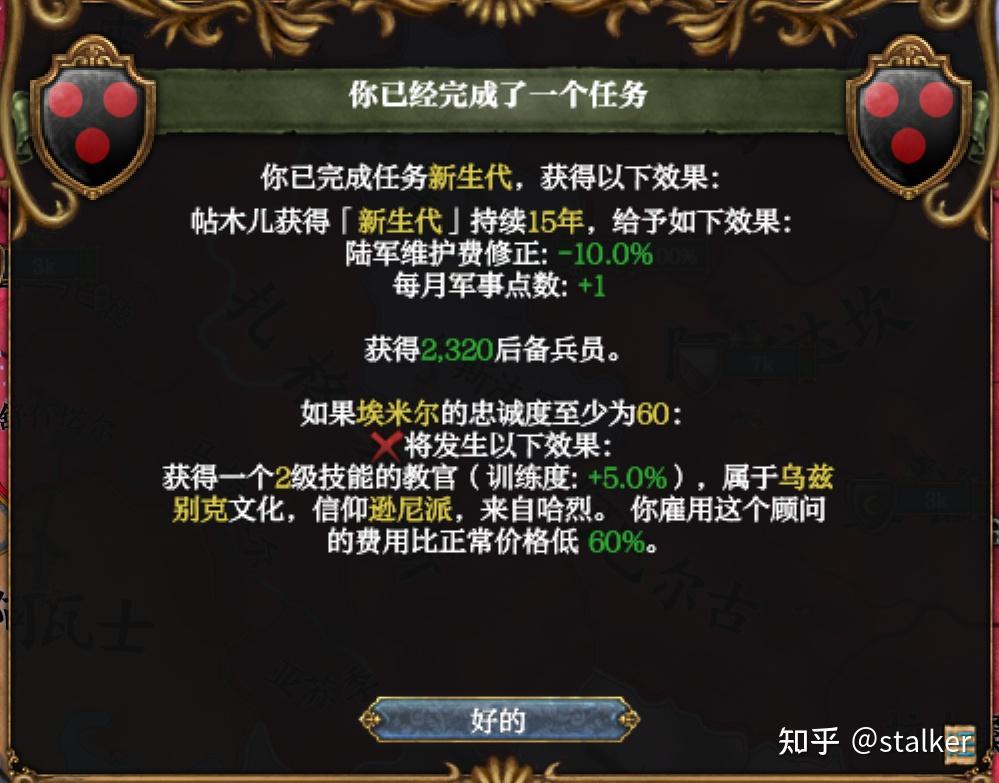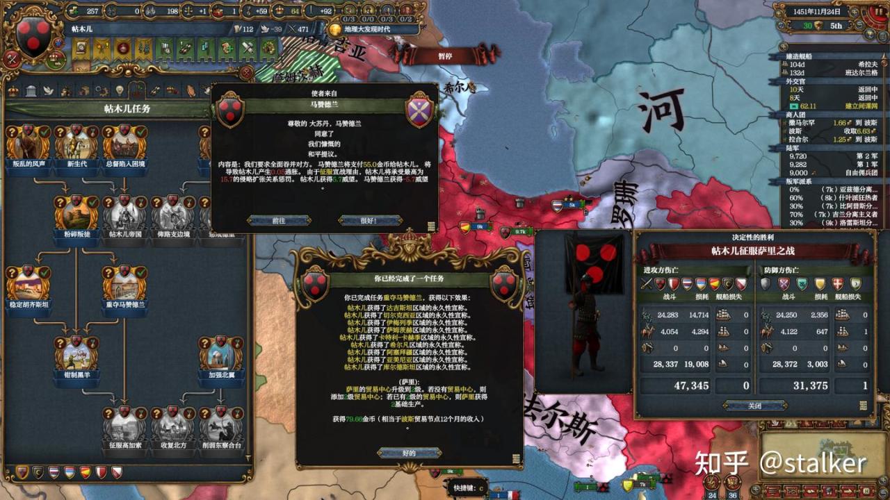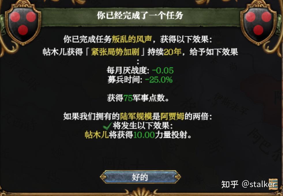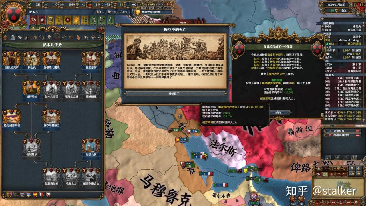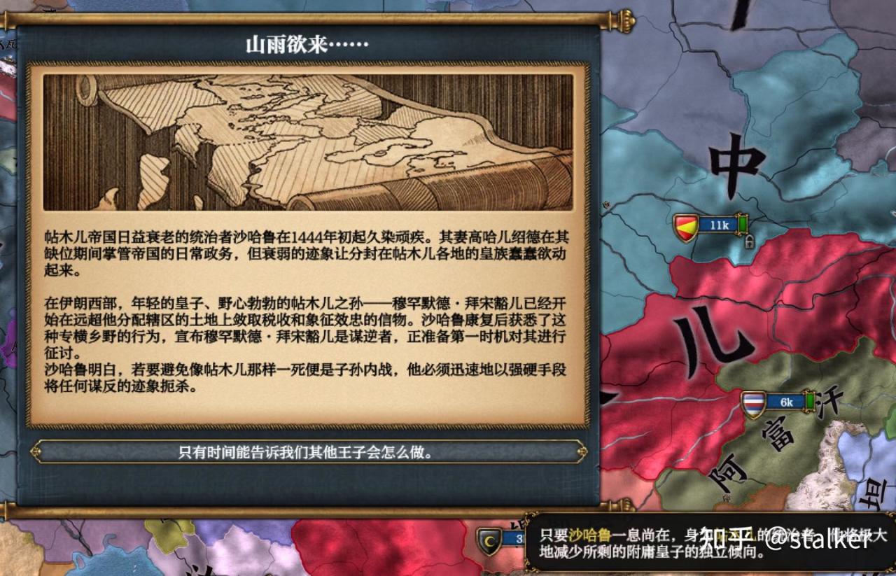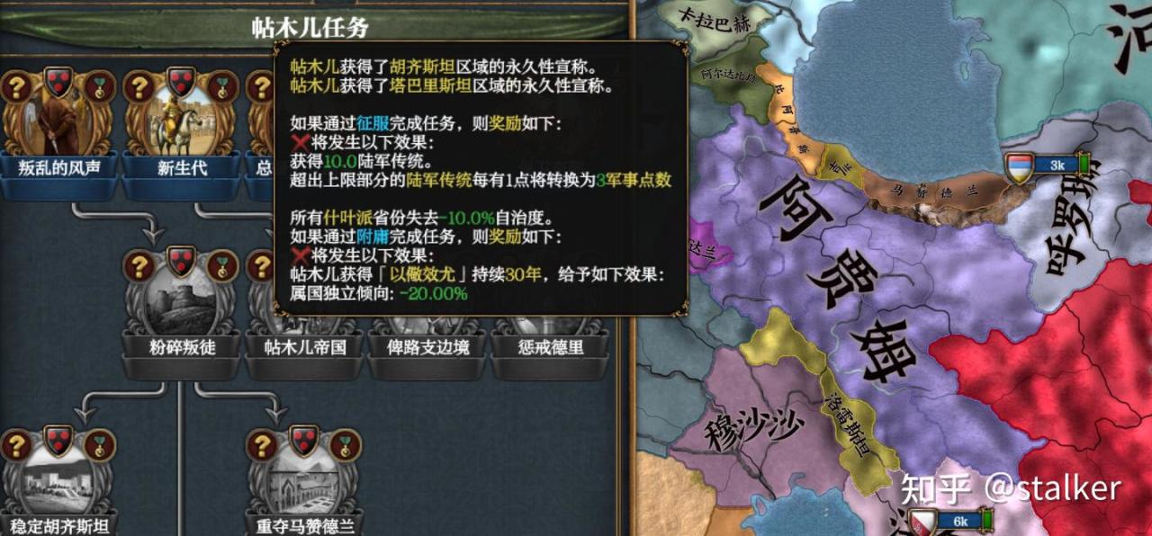 宣戰後即完成“叛亂的風聲”任務,同時開局即僱傭自由傭兵團,確保兵力是阿賈姆的兩倍,拿到額外獎勵。帖木兒開局能快速完成的任務拿175軍事點,而且沙哈魯軍事能力有5,軍事科技升的很快。