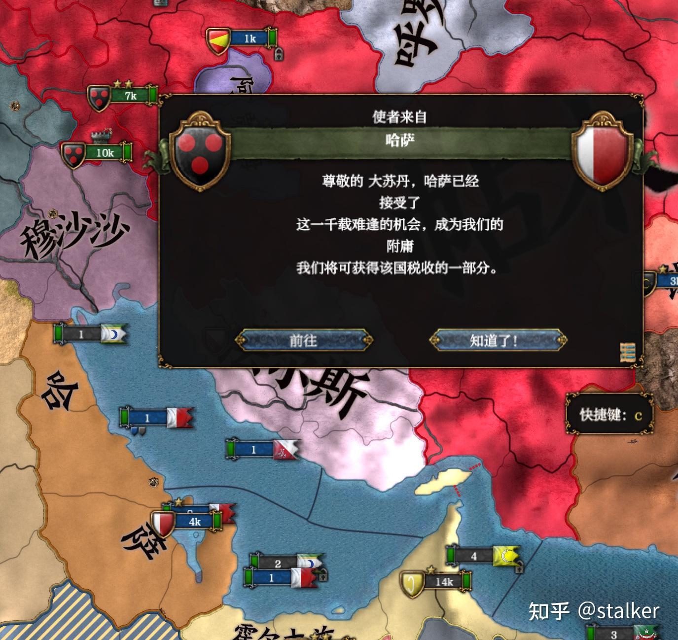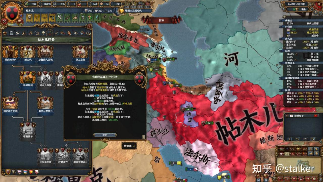阿賈姆無條件投降,此時沙哈魯尚在(SL了兩次),因此喫100分地停戰,接壤黑羊和穆沙沙。如果此時沙哈魯已經去世,急需降低附庸的獨立傾向,則可以不喫阿賈姆的小弟,給他剩一塊地並在和平條約中附庸,正好100分,則任務的兩個獎勵都能拿到。不過這樣他兩個小弟就會獨立,且和帖木兒有15年停戰期,有可能卡後面的任務。