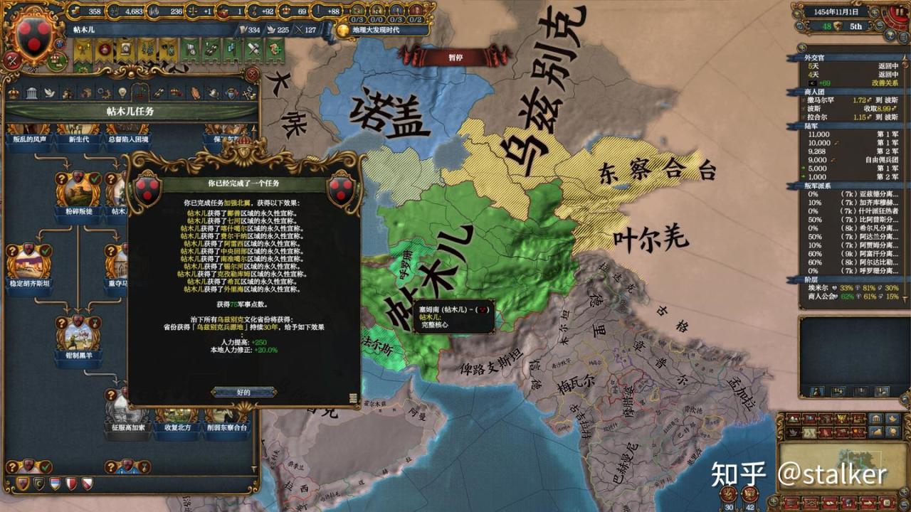 考慮其他國家也有相關成就,莫臥兒就交給河中、阿富汗等帖木兒屬國了,波斯就交給奧地利了,本局會選擇遊牧路線,重建蒙古帝國(就不交給條頓騎士團了)。