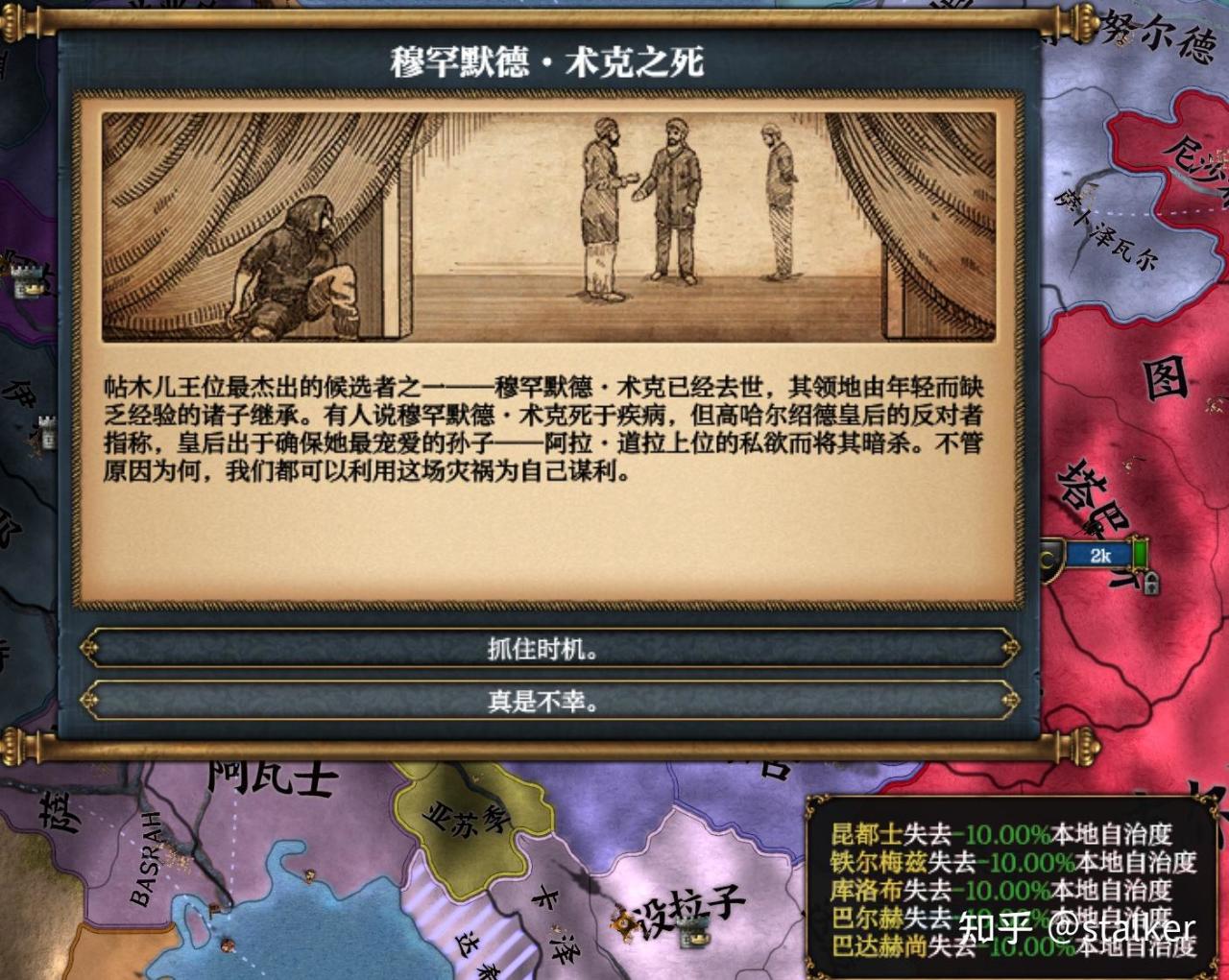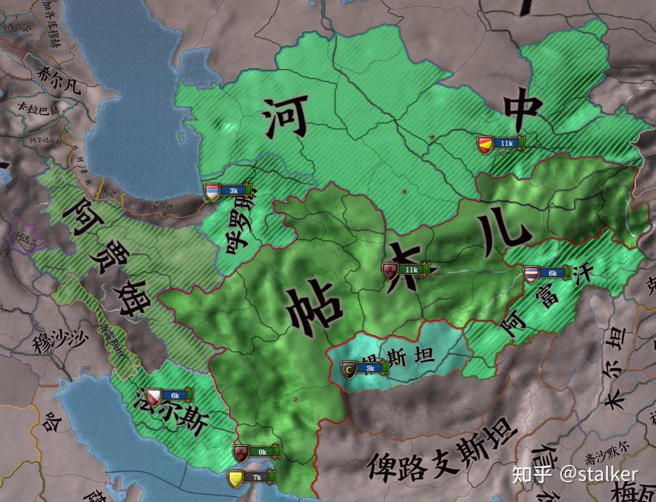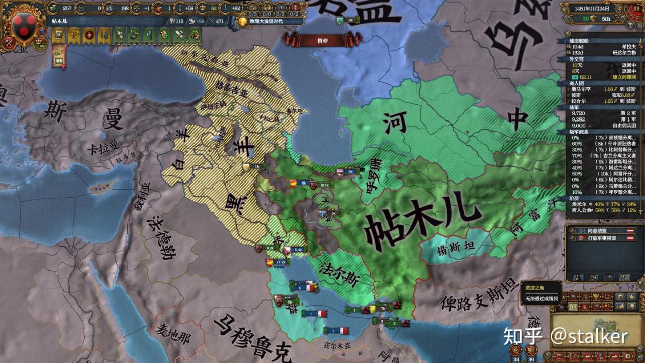 控制巴士拉區貿易點的穆沙沙與黑羊結盟,控制裏海南岸波斯重要貿易點的馬贊德蘭也與黑羊結盟,一併宣戰。穆沙沙隨着帖木兒帝國過往的衰退而興起,是信奉千禧年注意的什葉派穆斯林,開局有100的神祕主義,是周邊小國的好打手,歷史上被快速崛起的薩法維波斯滅亡,不過在本時間線要被帖木兒吞併了。