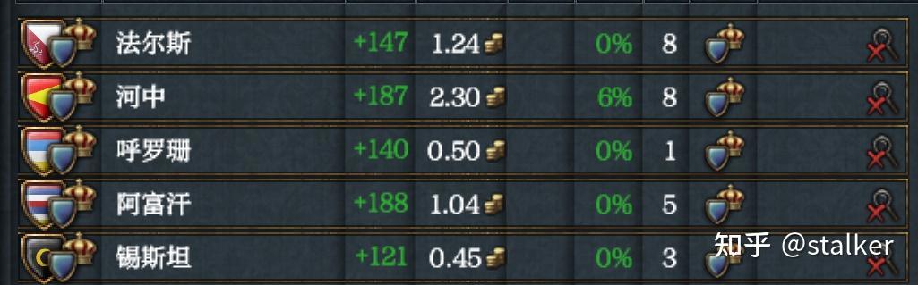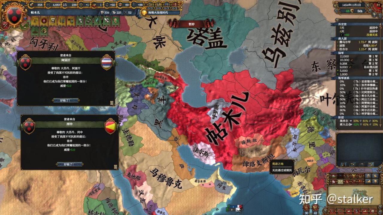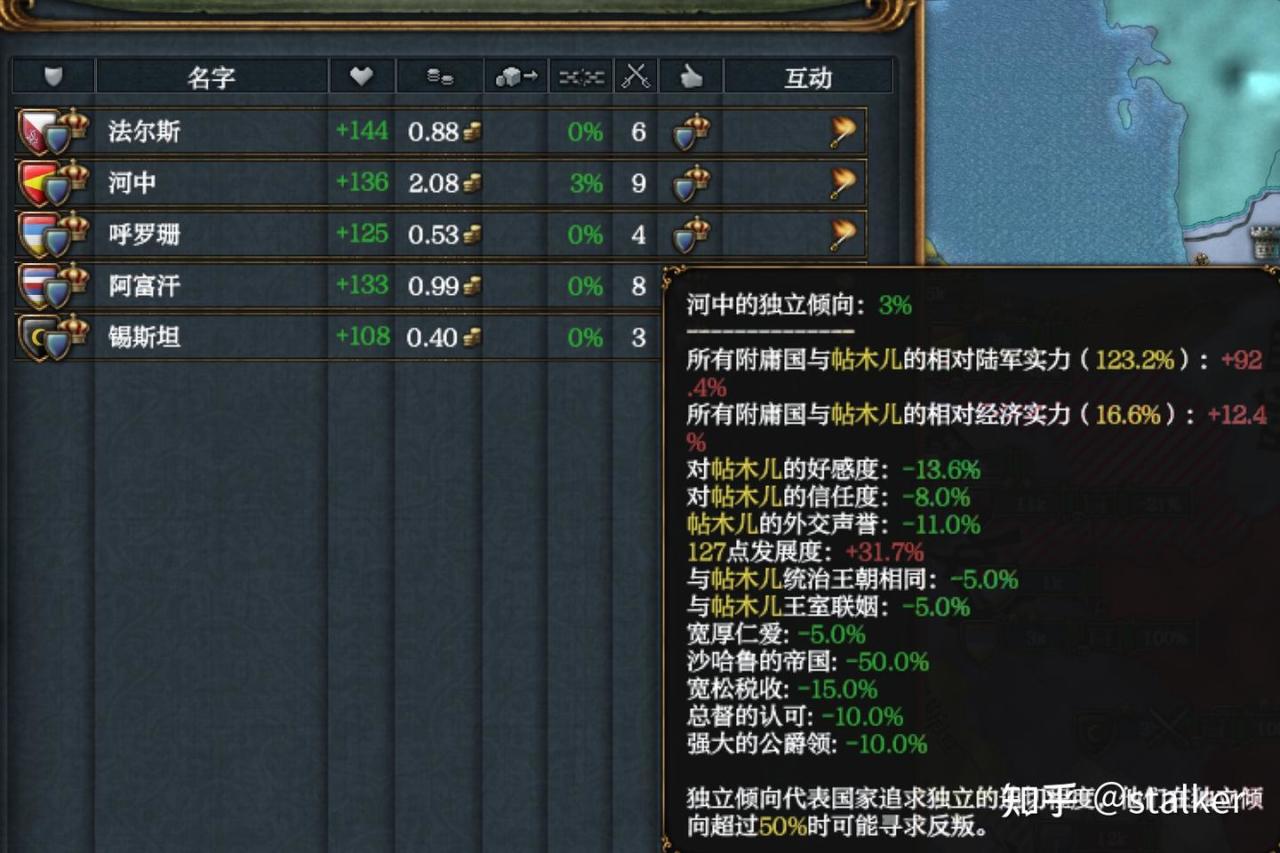 攘外必先安內,除了錫斯坦,帖木兒擁有其他四位附庸和阿賈姆的全部核心,這就意味着只要開局十年後壓制附庸的獨立傾向在50%以下,並且搞好外交關係,就能秒吞附庸,大幅增強實力。