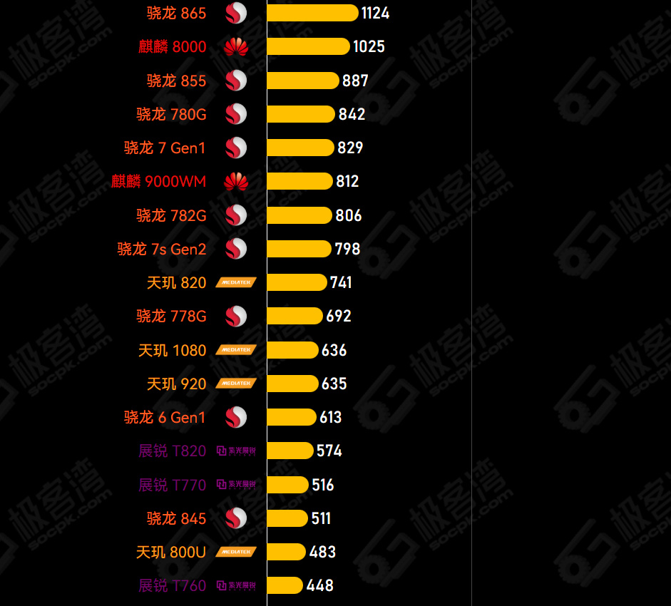 繼續對內存超頻後,性能提升11.7%,性能跟麒麟8000接近了。