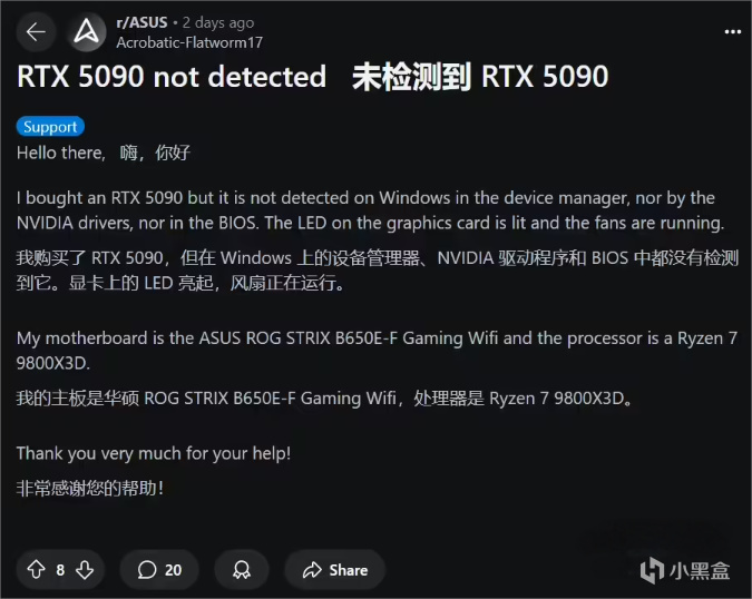 在华硕的Reddit论坛上,有用户表示其RTX 5090显卡在Windows系统中既无法通过BIOS识别,也无法通过驱动程序识别。