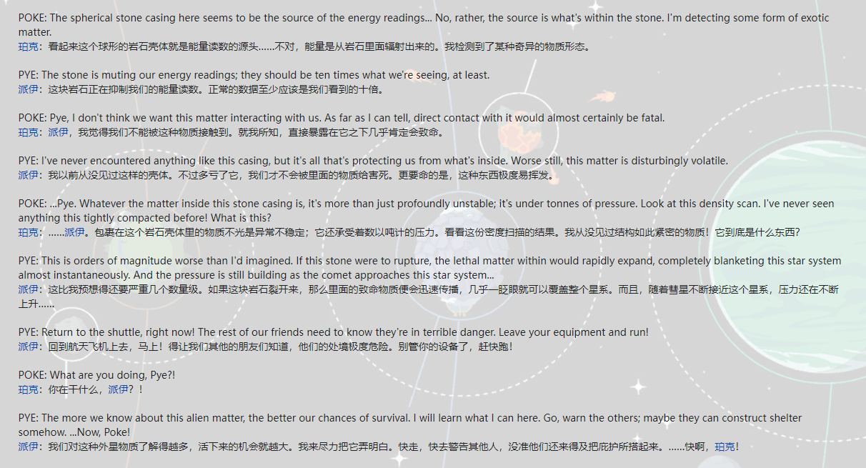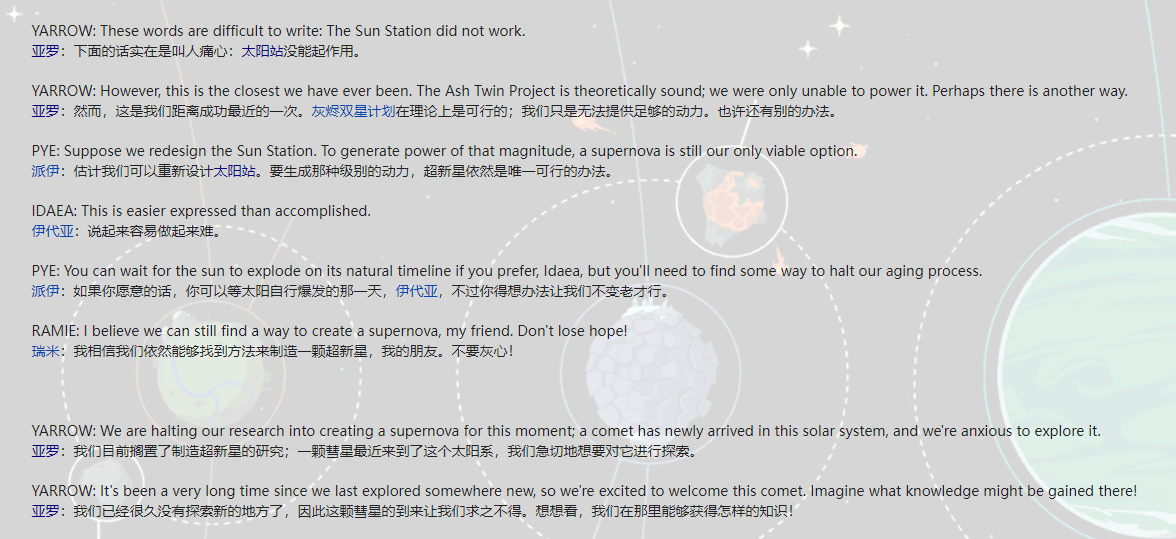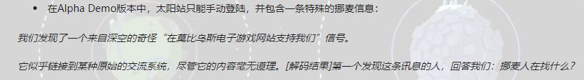 當然,以上內容都是純純的胡思亂想,有一點推論性質,但遊戲裏找不到任何直接證據證實我的推測。所以寫出這篇文章,只是希望和大家分享一下對《星際拓荒》這一處罕見留白的見解,權當拋磚引玉,供各位討論。