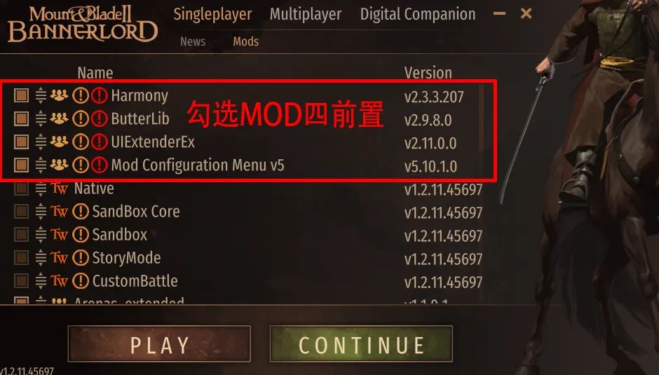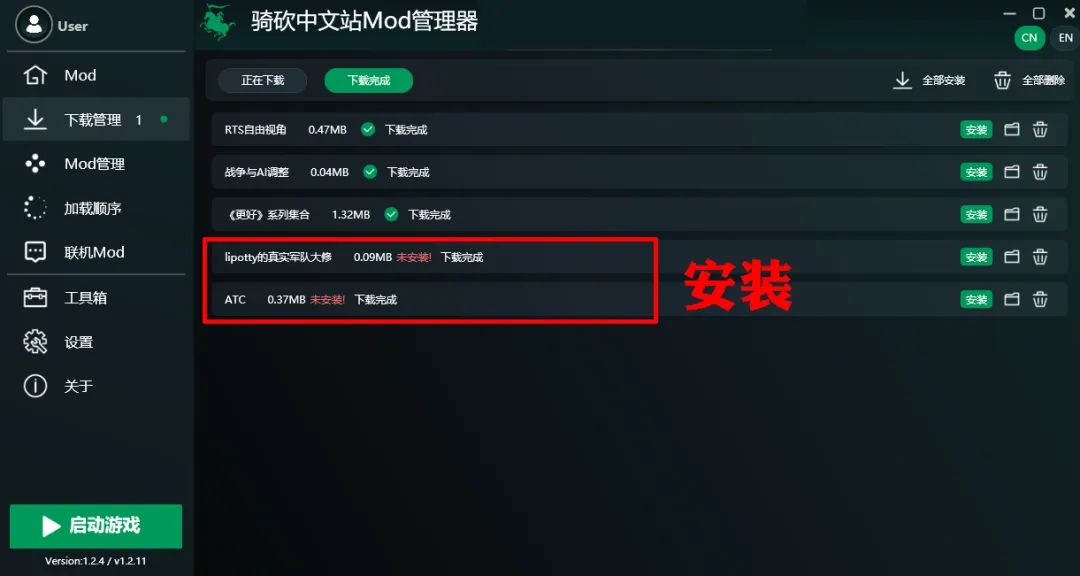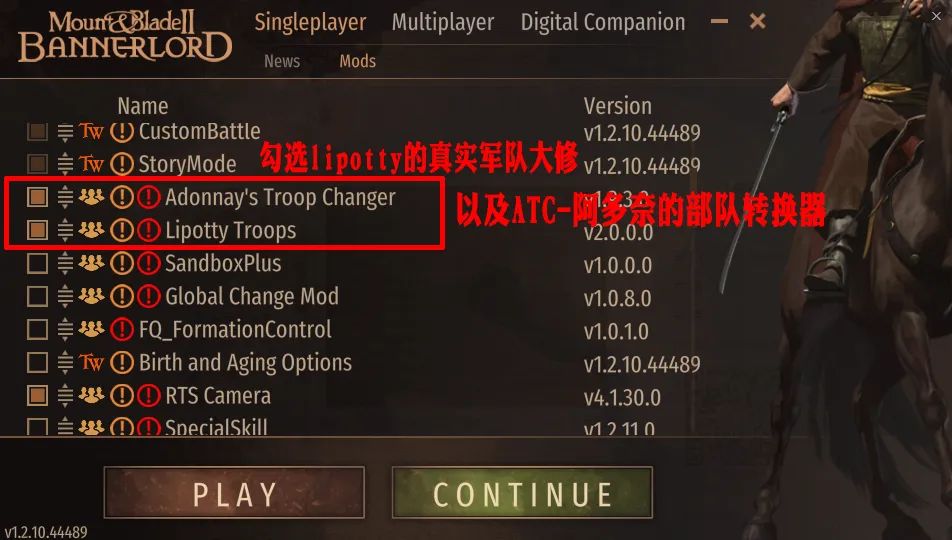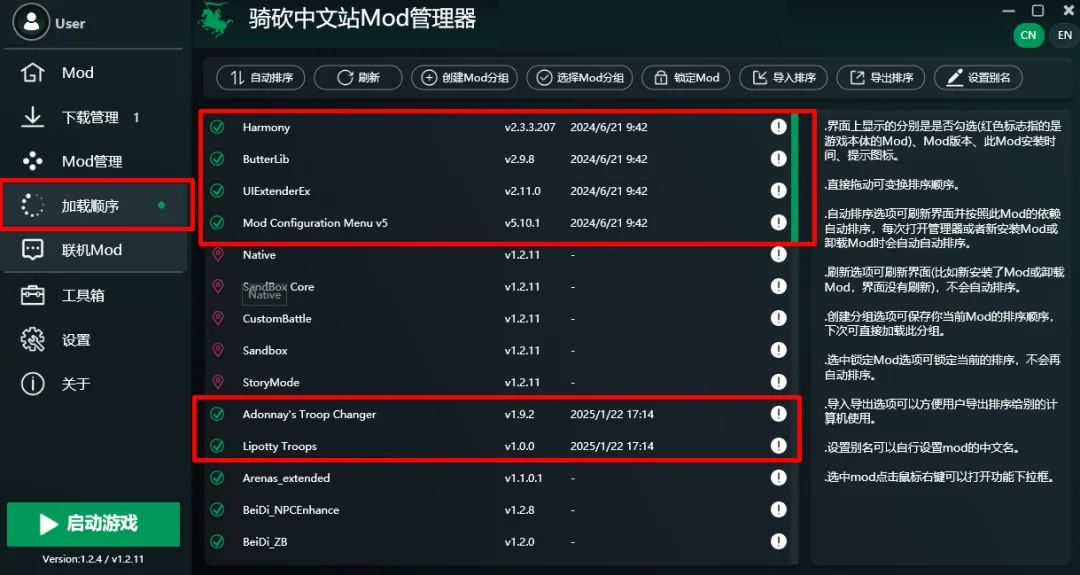 3、安裝好“lipotty的真實軍隊大修”MOD後,打開啓動器,按照下方圖片進行排序即可進入遊戲