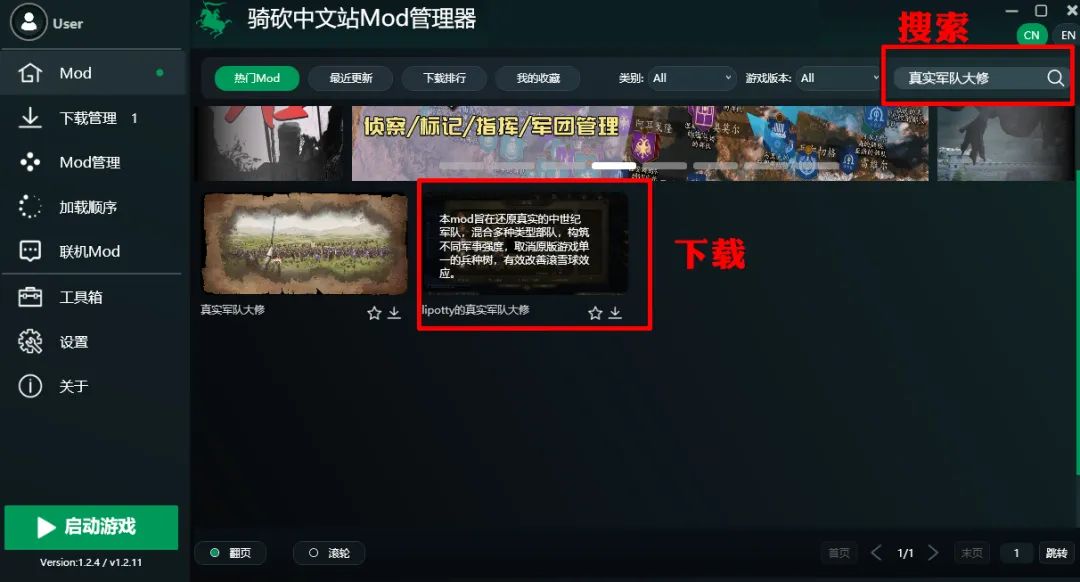 也可以直接百度搜索“騎砍中文站 下載中心”,進入下載站後搜索“lipotty的真實軍隊大修”進行下載。