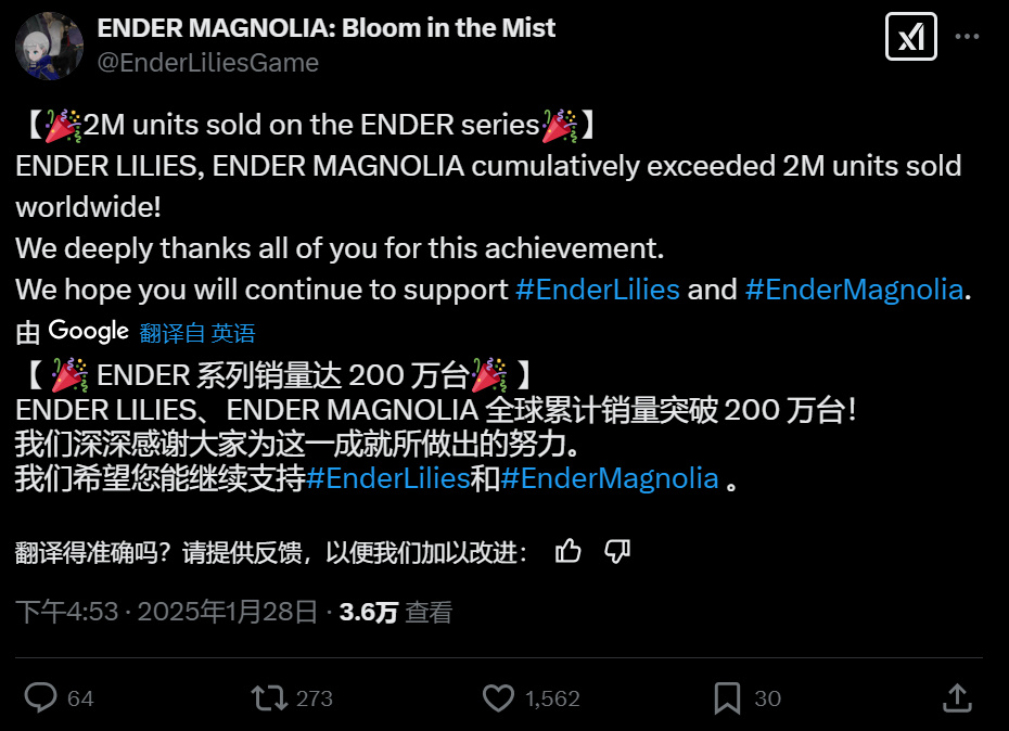 就在游戏正式发售四天后,官方推特账号公布称“终焉”系列的总销量突破了两百万,一方面说明《终焉之玛格诺利亚:雾中盛放之花》卖得同样不错(目前的好评率也比前作略高),另一面也代表着“终焉”系列完成了IP化。
