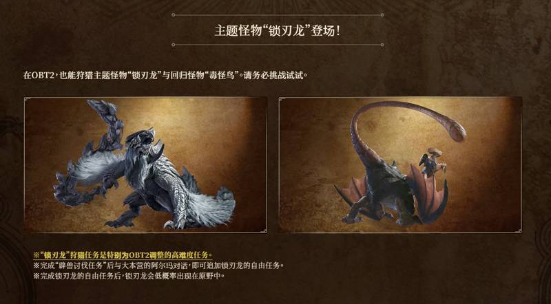 二次公測怪物除了早前官方公佈的“毒怪鳥”外,本作封面怪“鎖刃龍”也確認加入了進來。地圖測試依舊爲“天塹沙原”。大廳內可直接前往訓練場,方便大家瞭解14把武器的基本性能。公開二測在線功能提升,此次大家可以直接開啓私人大廳和單機在線模式了。注意,全程需聯網才能體驗