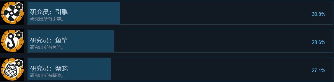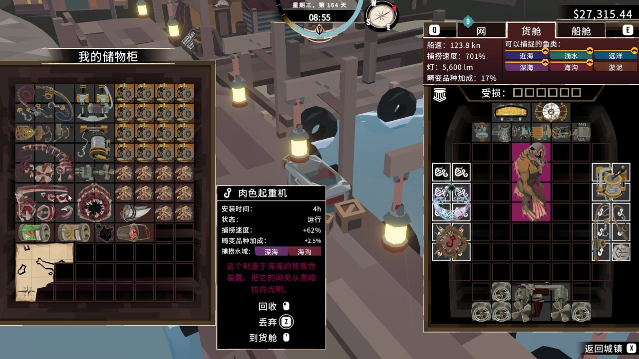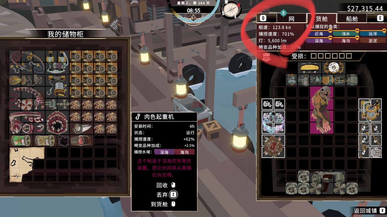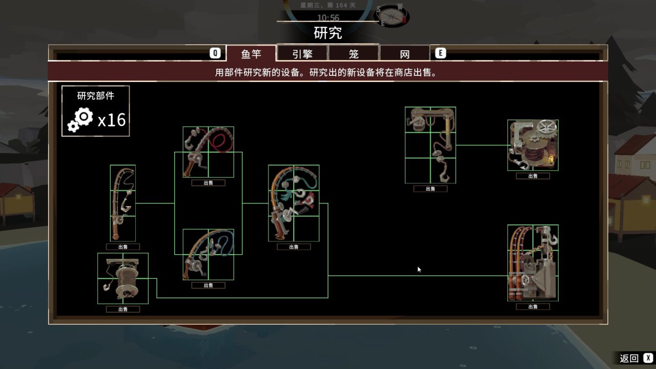 其次是升級裝備,這個需要你獲得足夠的研究部件,然後就魚竿,引擎,蟹籠,漁網的科技樹全部點滿。研究部件可隨機獲得,也可在商人店裏購買。